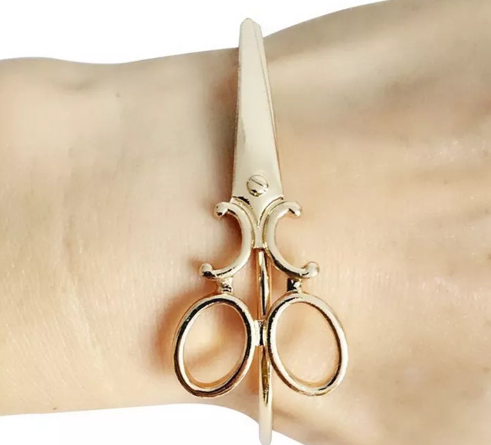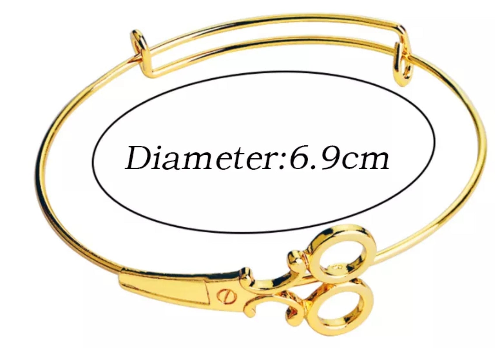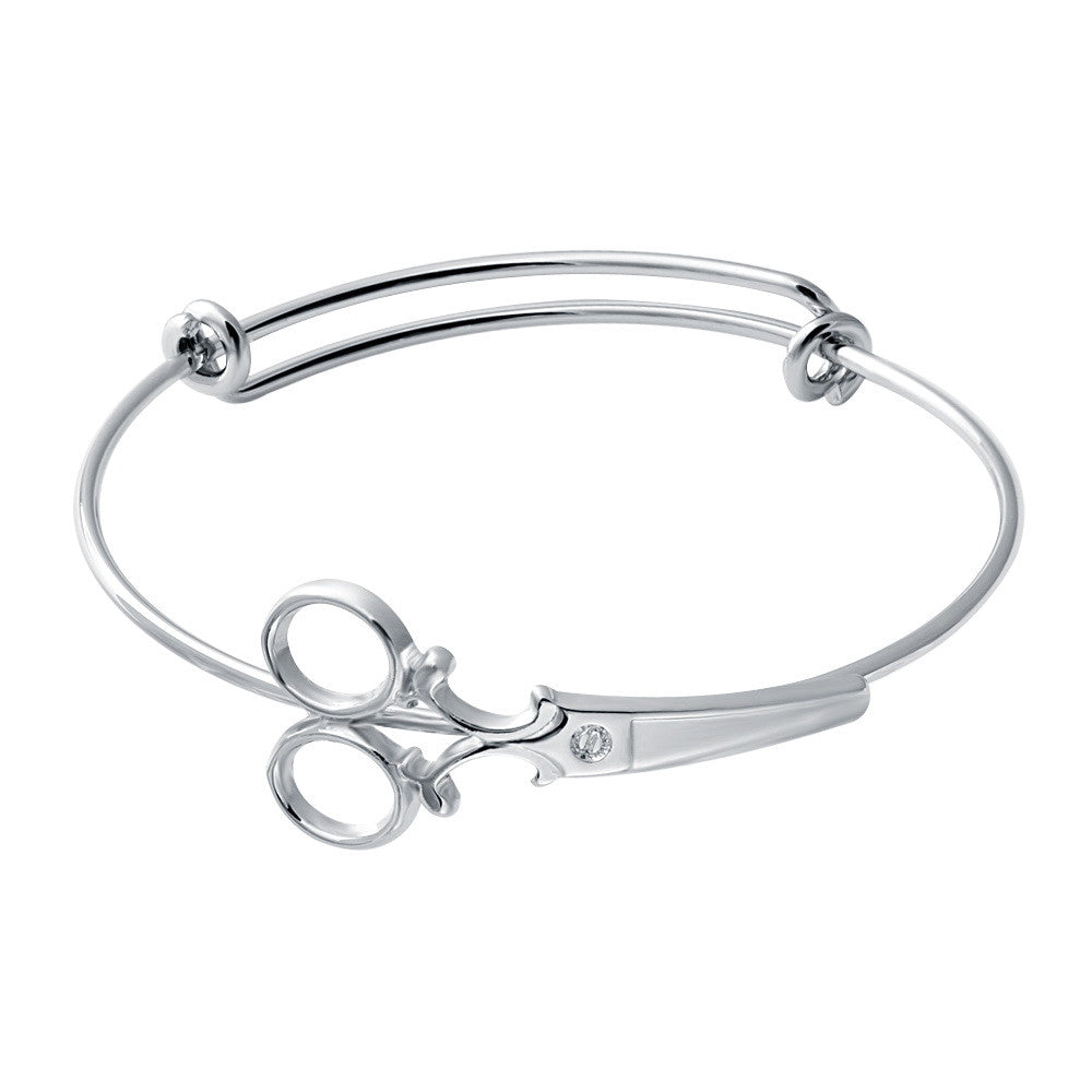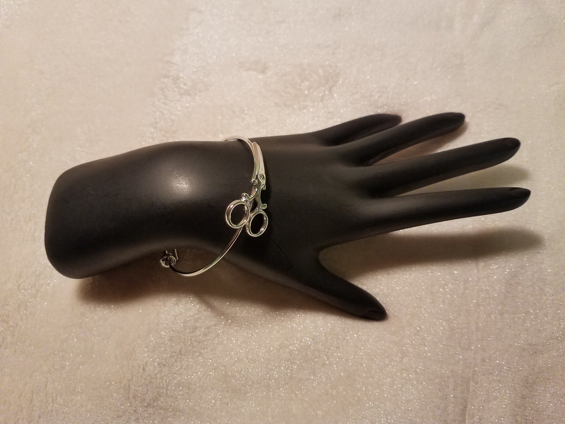 Adjustable scissor bangle. Silver without rhinestones. Perfect for the stylist that doesn't like a lot of flashy jewelry. Lightweight and fits everyone.