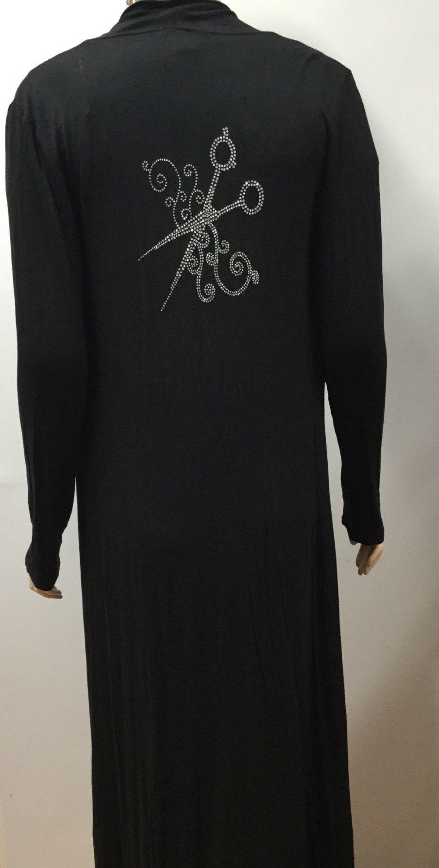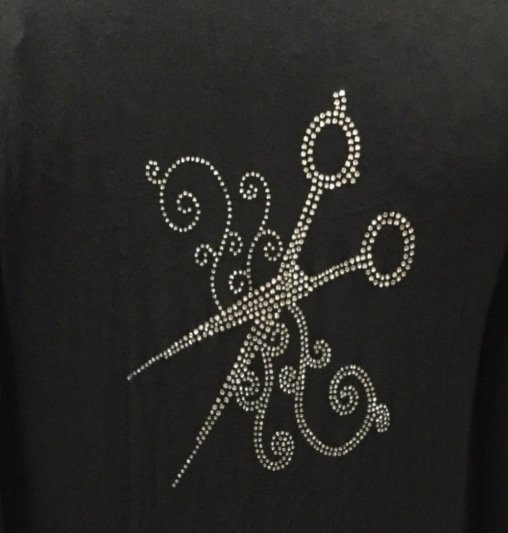 This cardigan is shorter in the front longer in the back. Has Scissor swirly Rhinestones on the back.