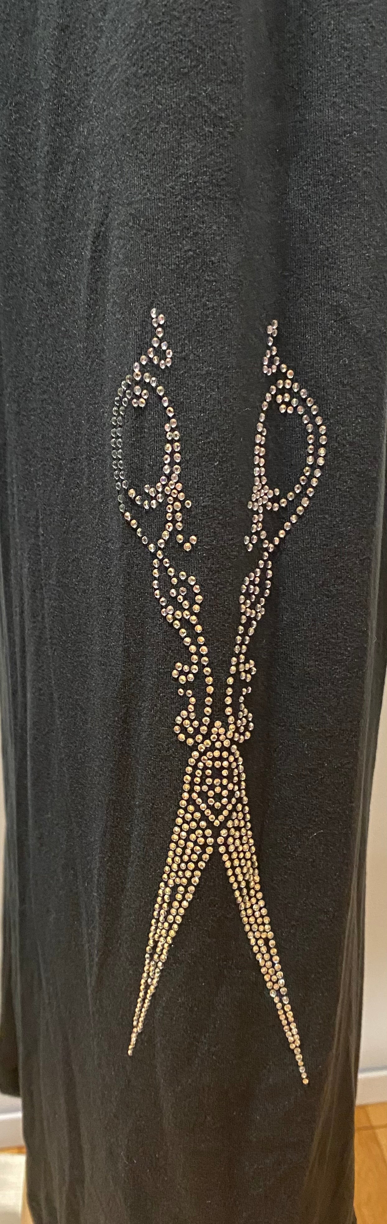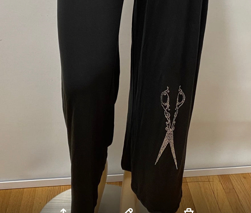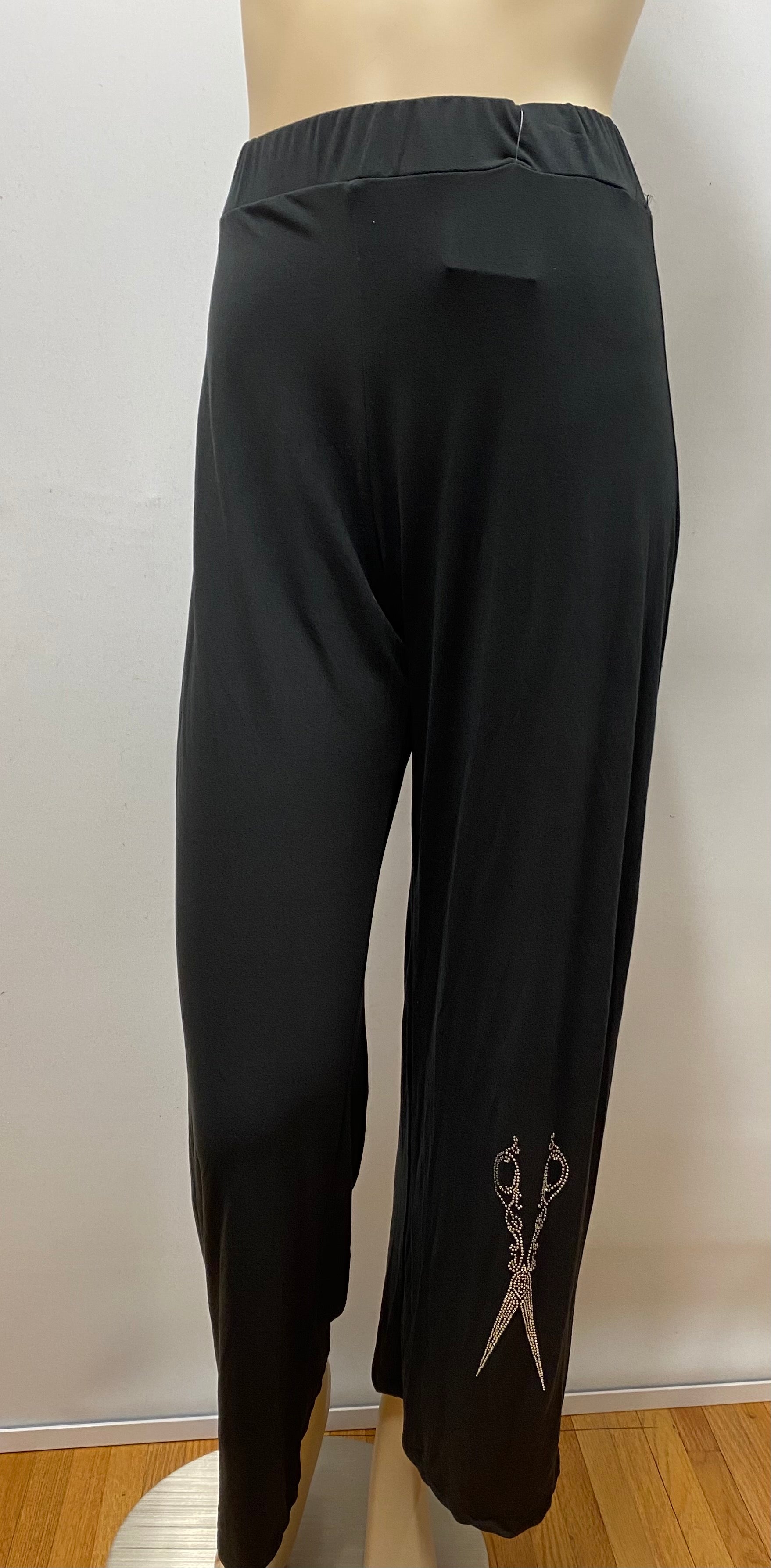 Black Palazzo that have a large scissor rhinestone on left bottom leg.