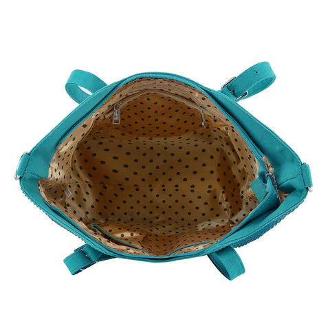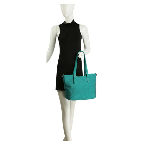 This Bling Shopper Tote Set with its canvas fabric and lined interior offers a clean and classic look with a touch of bling. The double handles plus a detachable strap and generous 12L x 11H x 5W size makes it perfect for everyday use. With 1 back zip pocket, 2 interior slip pockets and 1 zip pocket, it offers plenty of storage space and is also tablet compatible (std. size 8-10in). The set includes a matching stone bag for elevated versatility. Silver hardware accents complete the look.