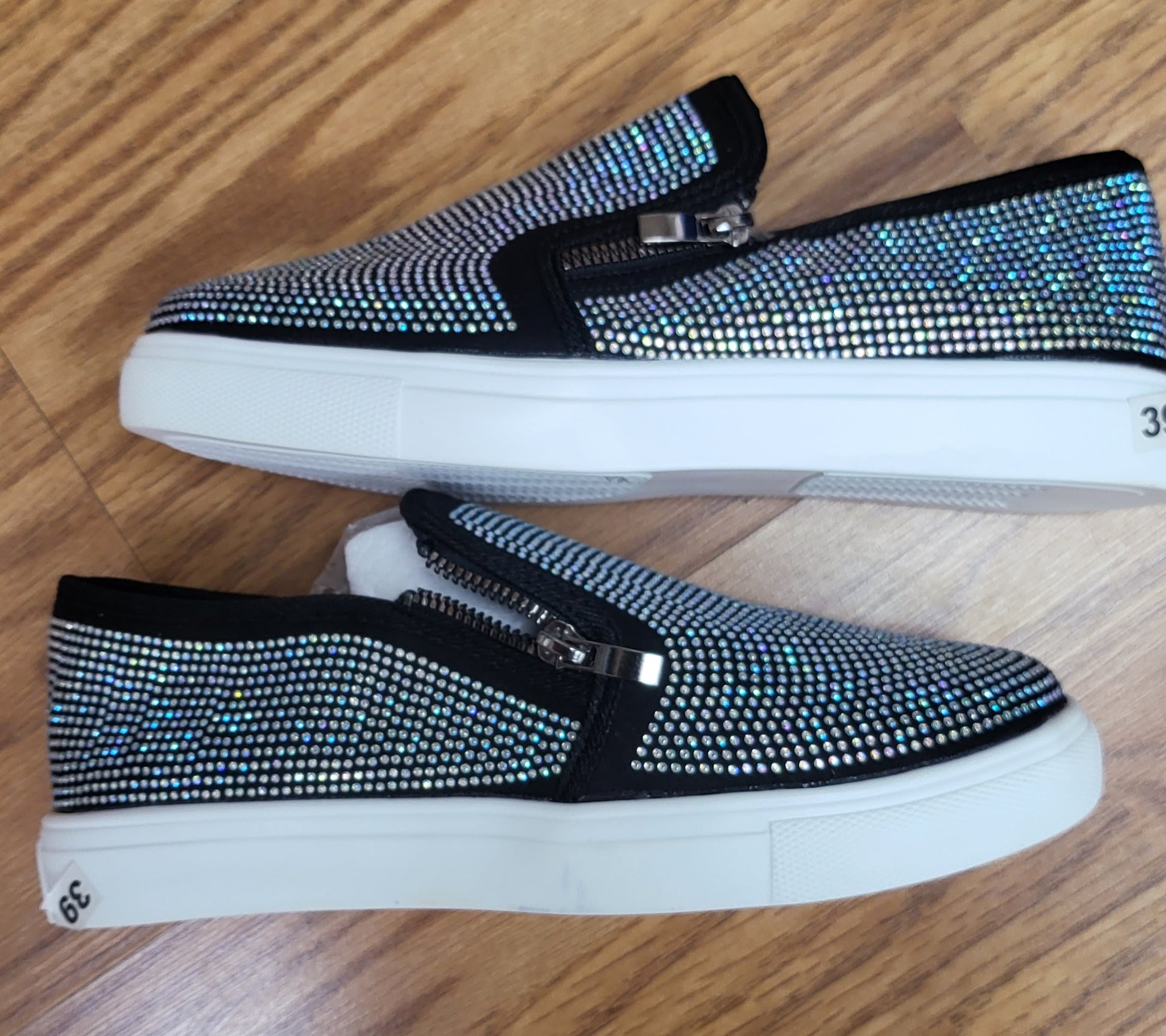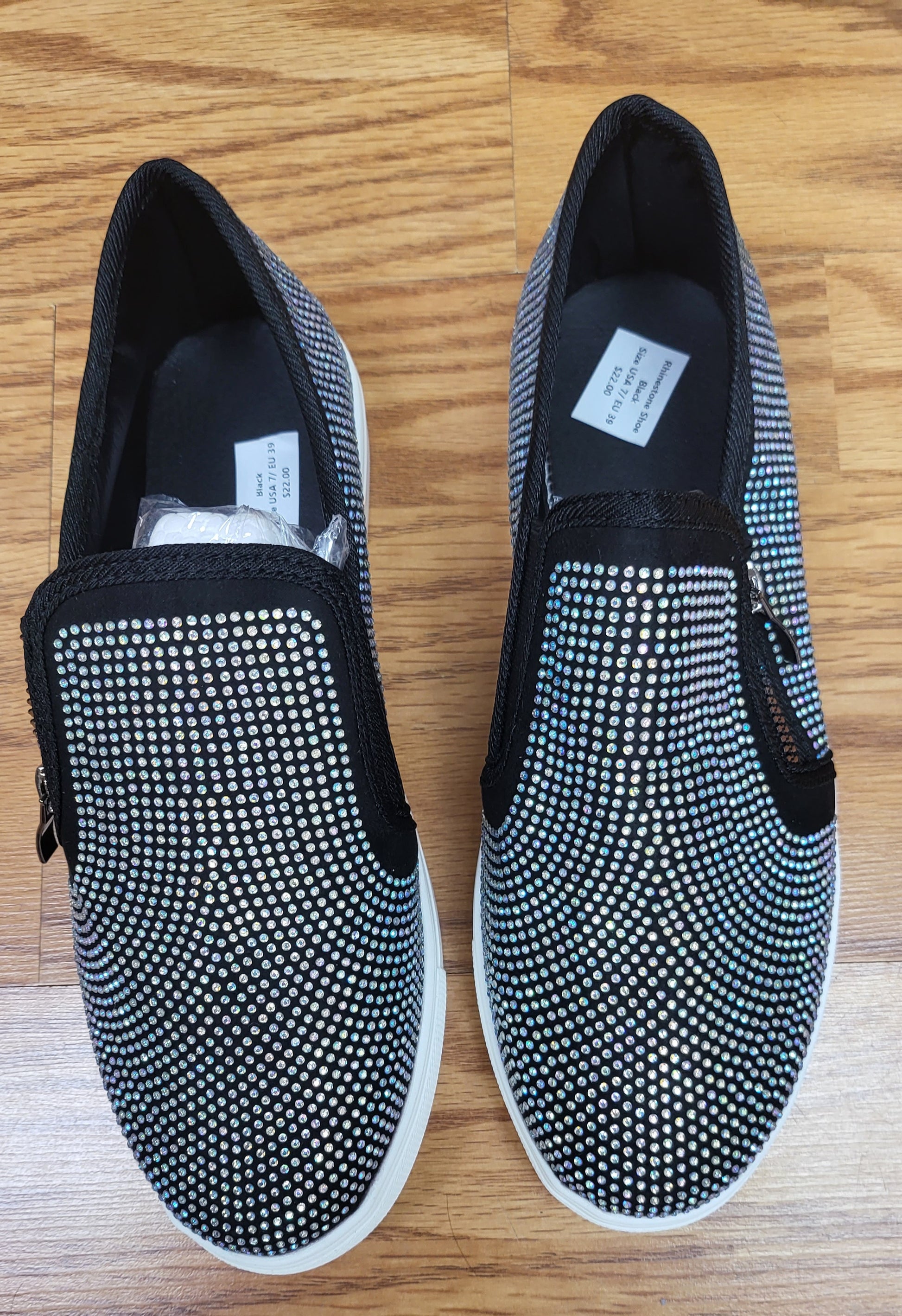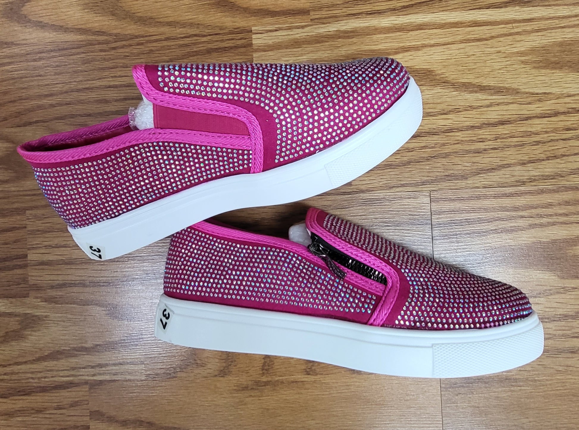 These slip on sneakers provide the perfect burst of style to any look. With a lightweight design and an eye-catching zipper accent, these shoes are easy to wear and make a great addition to any wardrobe. The AB colored rhinestones add a glamorous touch, making these shoes an ideal statement piece. Available in three colors, black tan and fushia, these shoes are sure to fit perfectly with their true to size fit.Canvas sneaker with iridescent rhinestones.