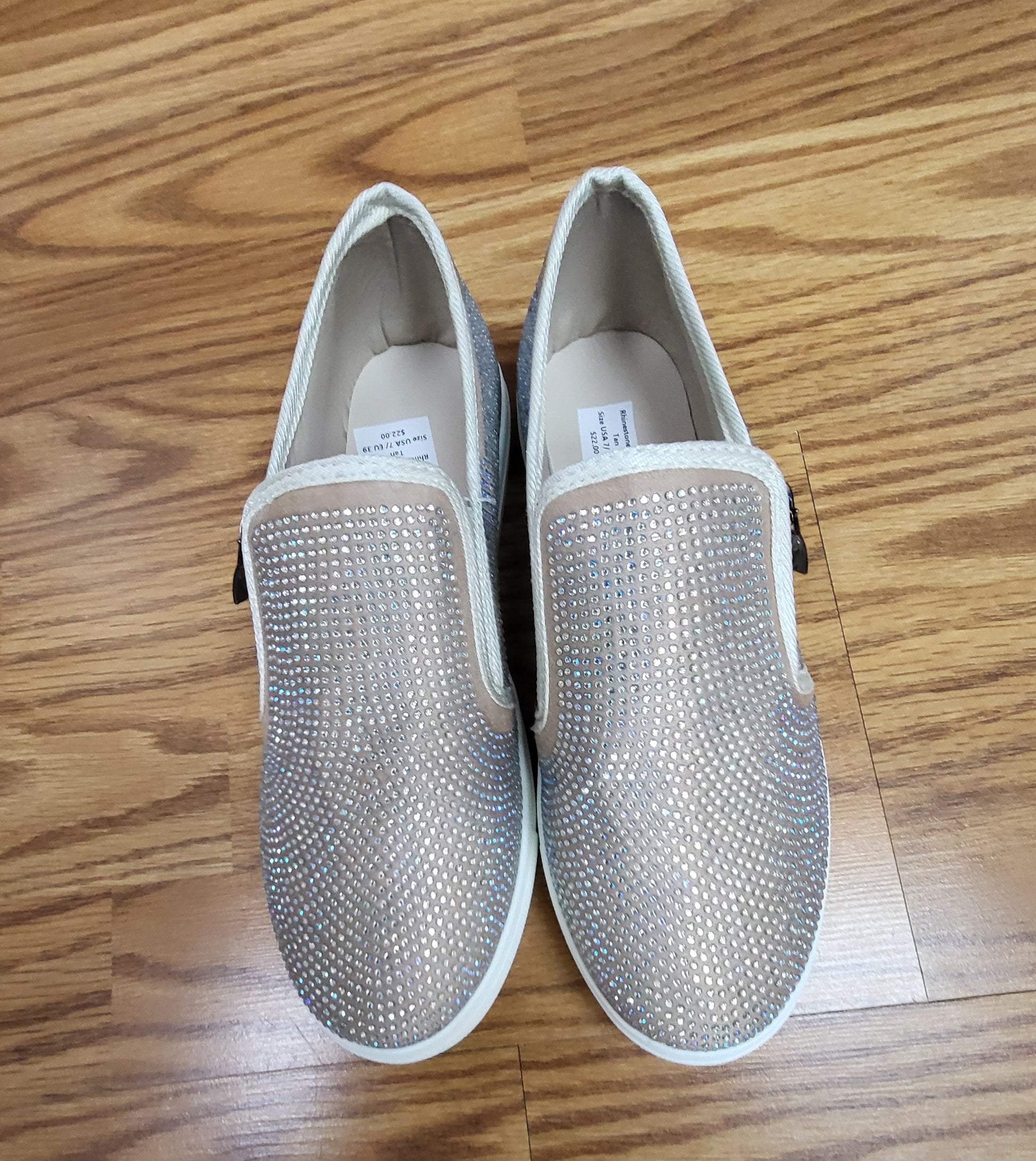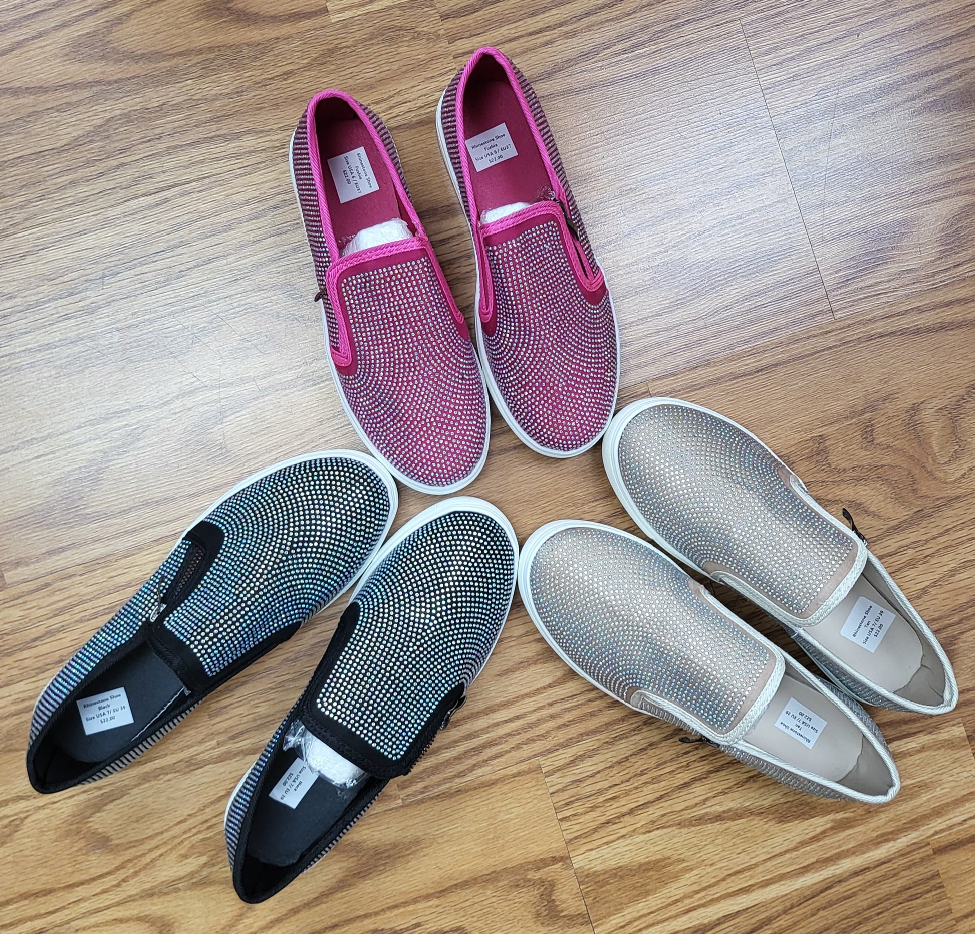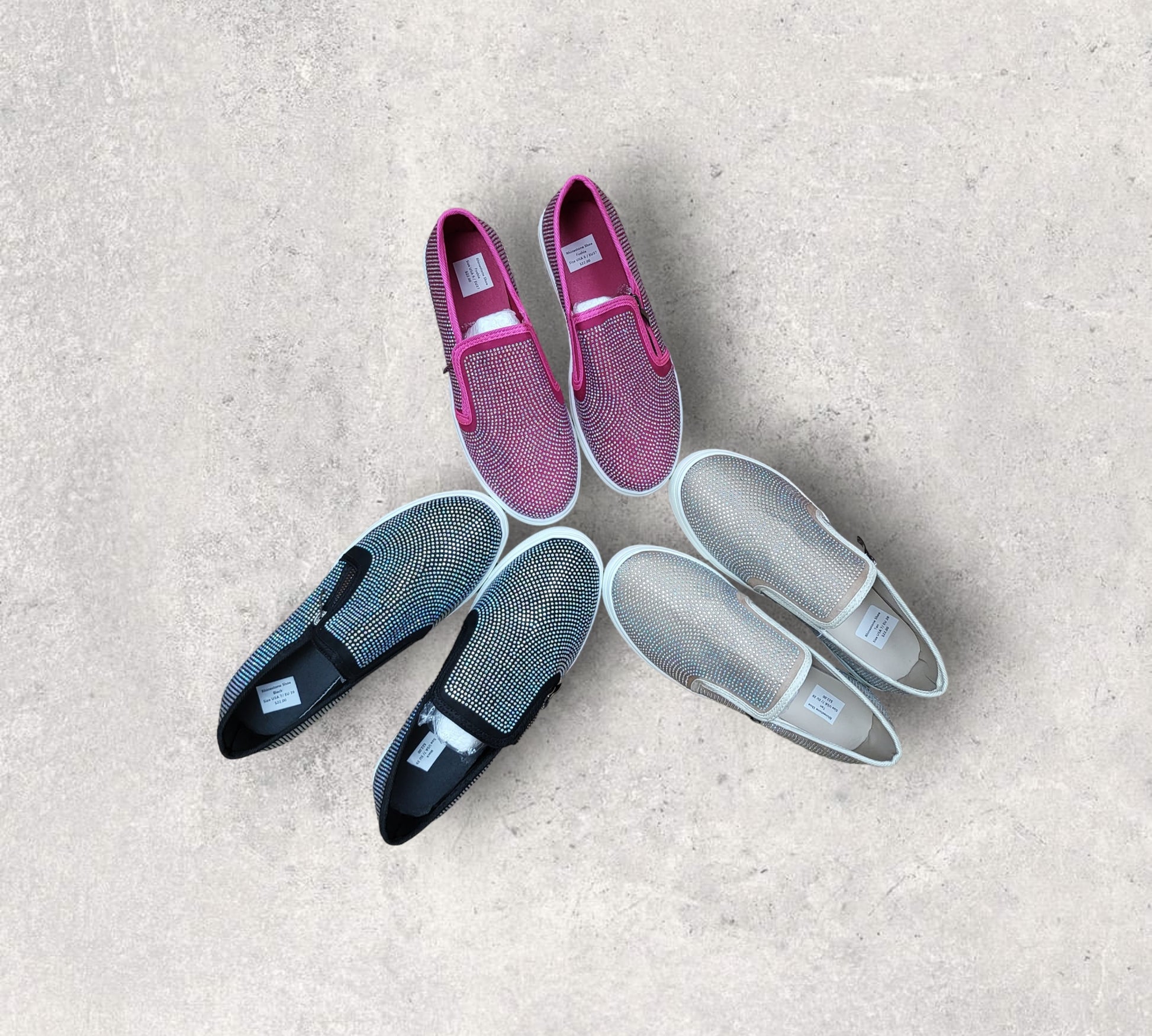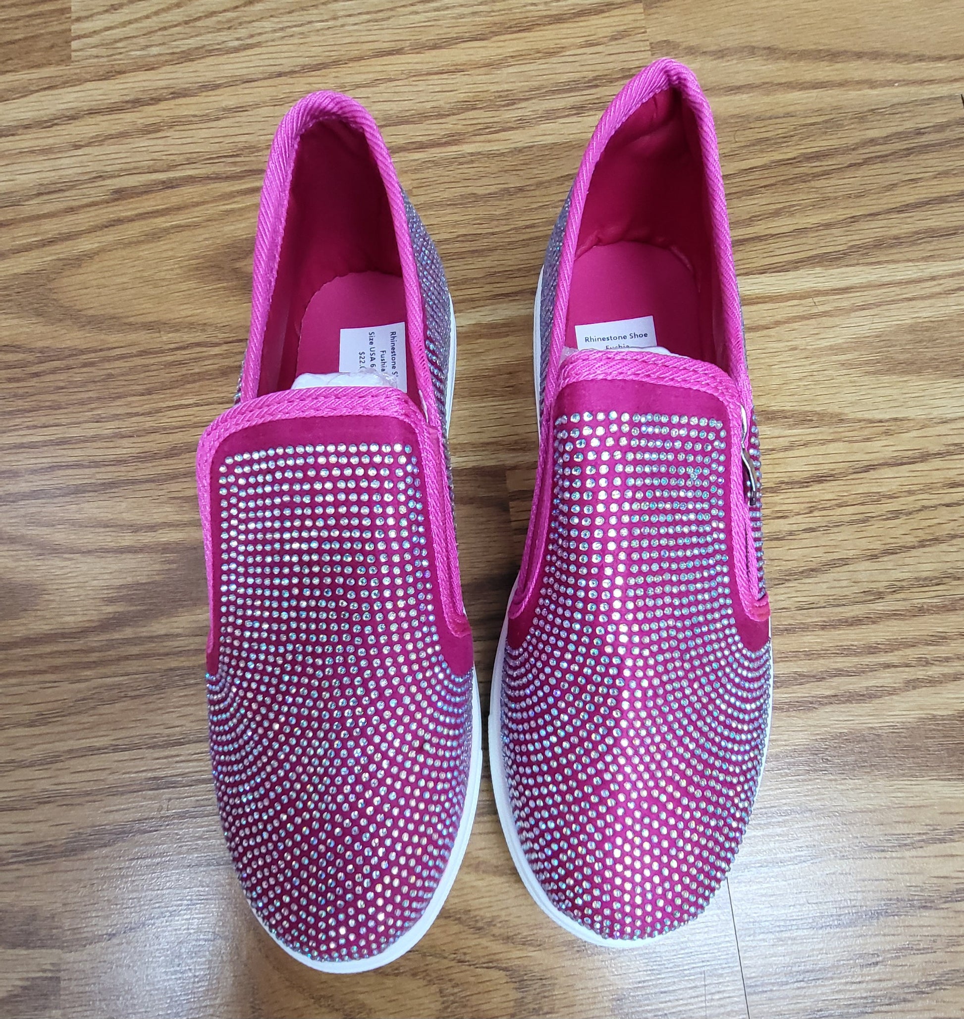 These slip on sneakers provide the perfect burst of style to any look. With a lightweight design and an eye-catching zipper accent, these shoes are easy to wear and make a great addition to any wardrobe. The AB colored rhinestones add a glamorous touch, making these shoes an ideal statement piece. Available in three colors, black tan and fushia, these shoes are sure to fit perfectly with their true to size fit.Canvas sneaker with iridescent rhinestones.