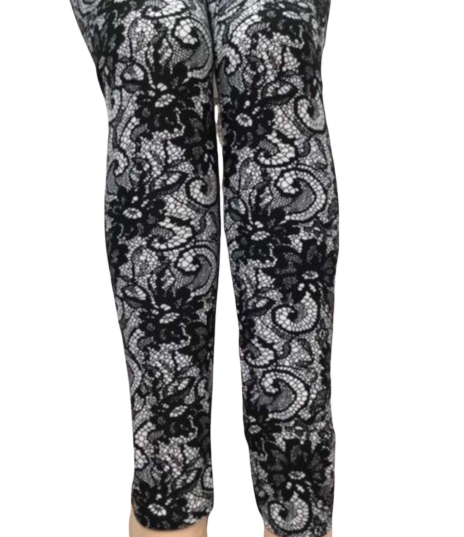 - Spice up your look with these super fun leggings, featuring a beautiful lace Print. These leggings are crafted with an elasticized waistband to provide a comfortable fit. Pair it with a fitted or loose tunic top and when it gets chilly, top off your shoulders with a classic denim jacket or bomber.