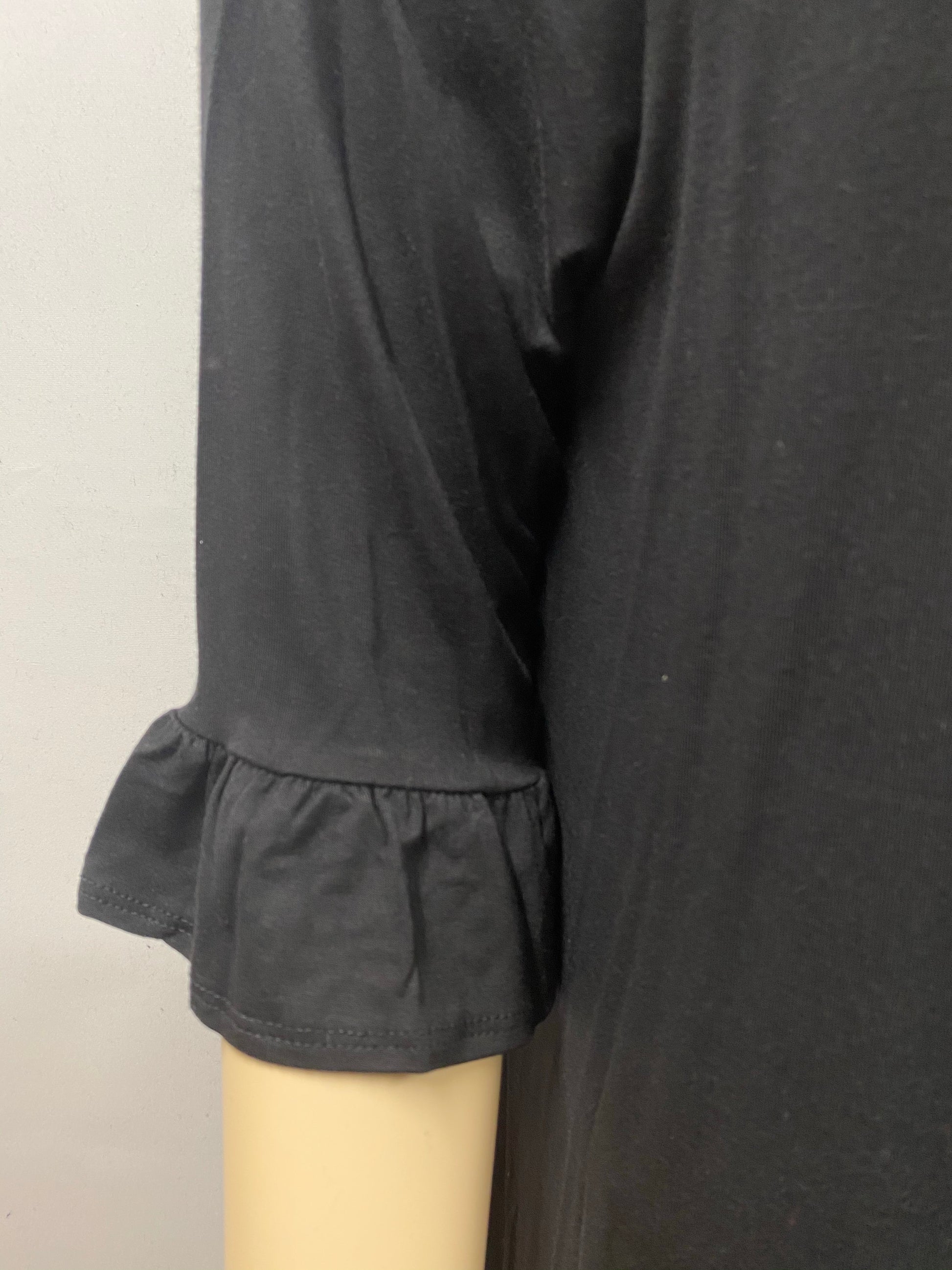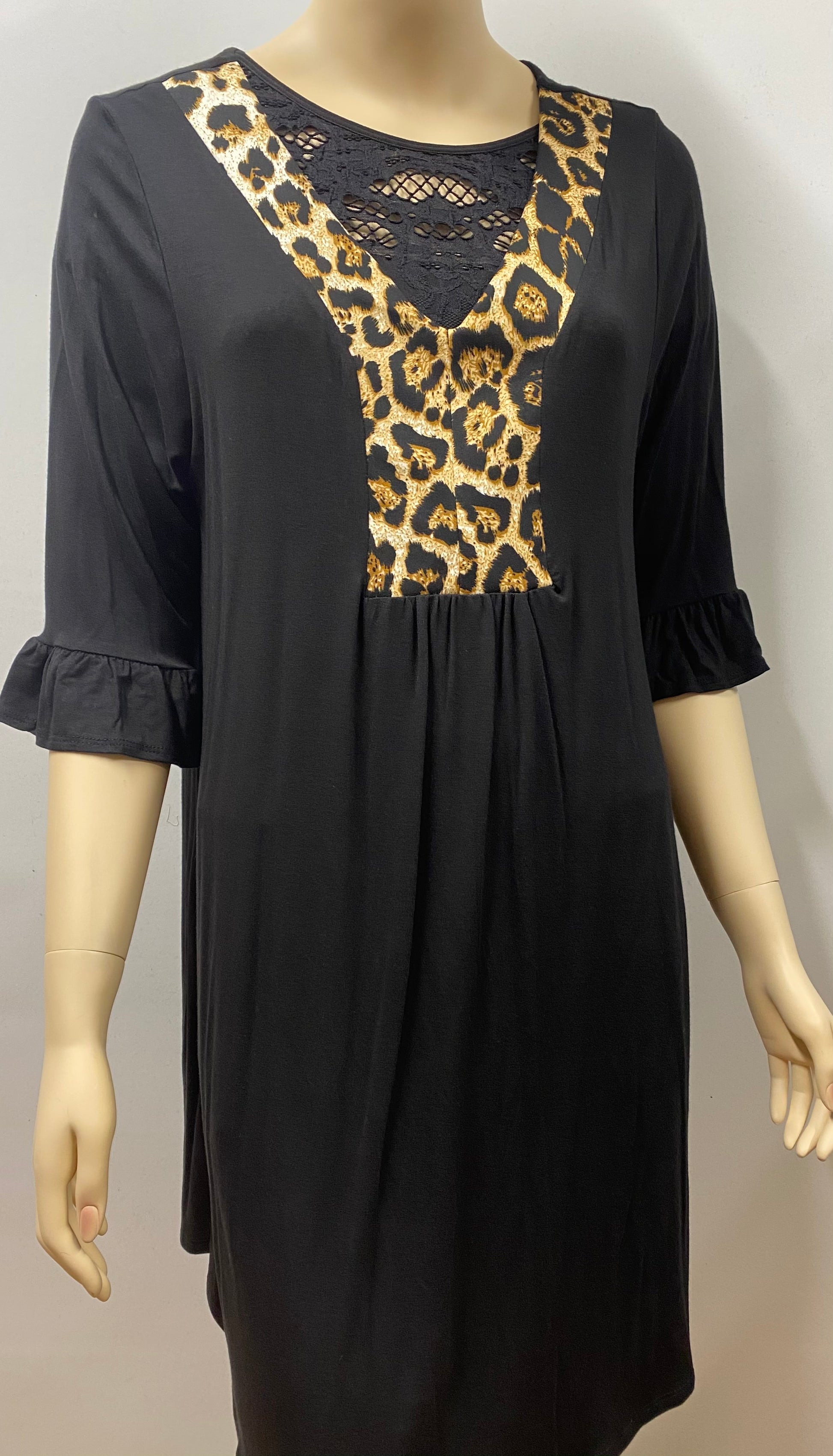 Solid, contrast dress with leopard print neckline and ruffle sleeves. Approx: Length: 34 in, Bust: 38 in, Sleeve: 15.5 in, Shoulder: 18 in Size based on size small.
