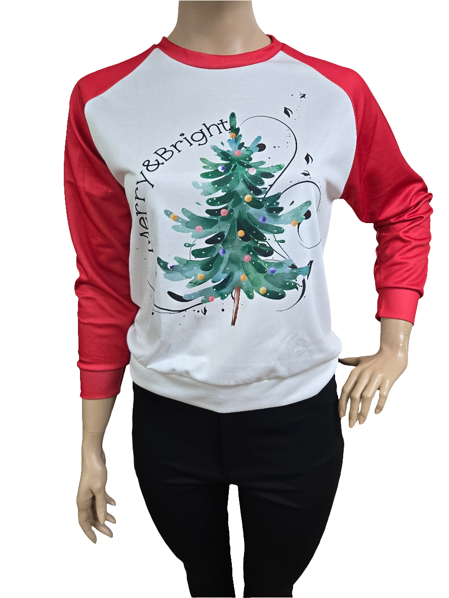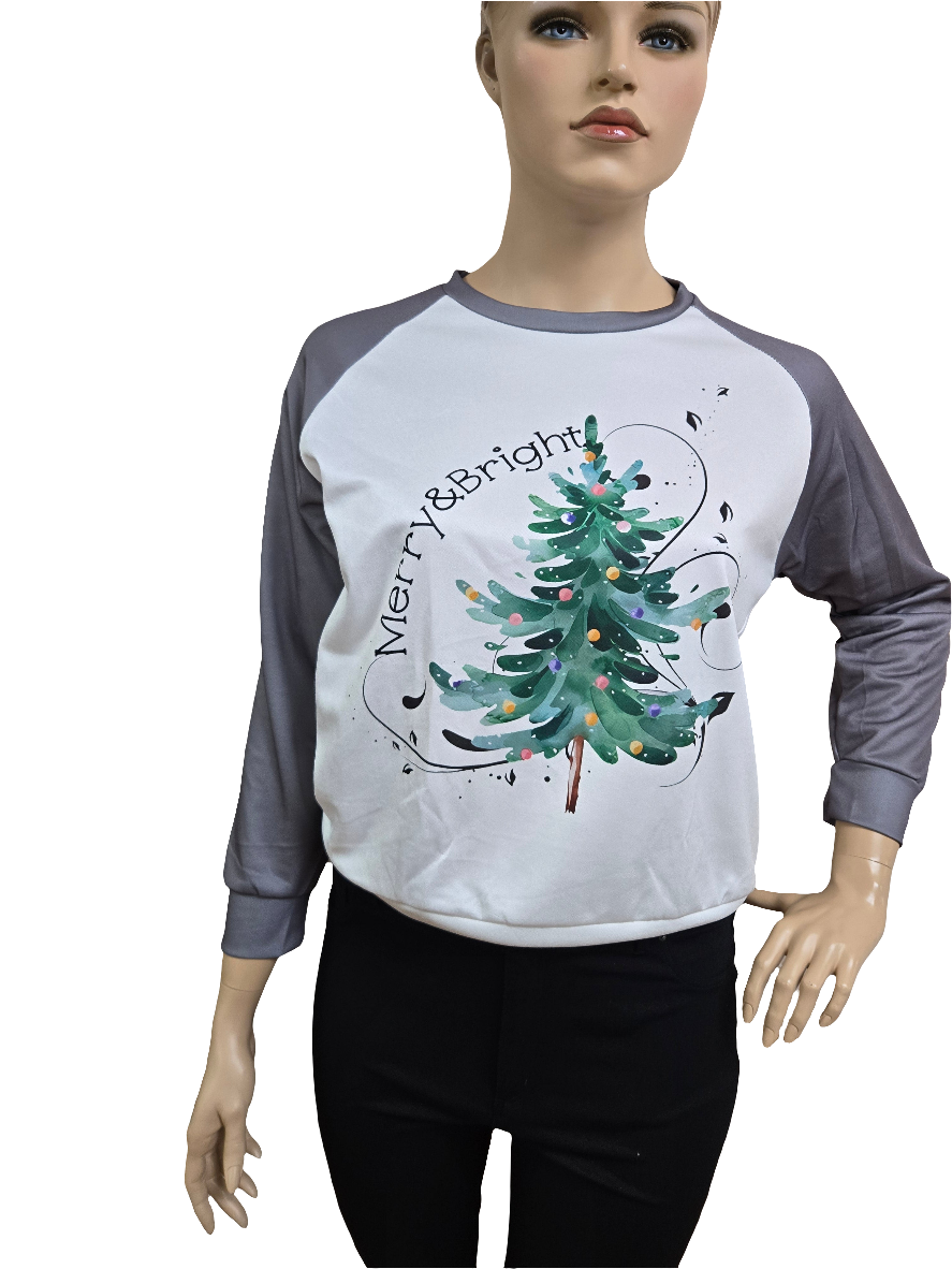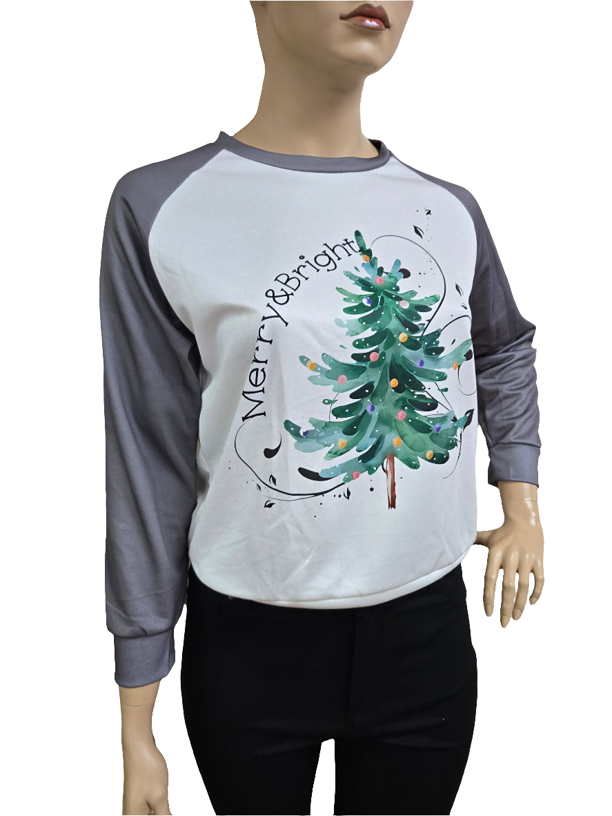 Get ready to spread holiday cheer with our "Merry and Bright Pull over Top! This cozy round neck sweater features long sleeves and a festive printed Christmas tree design. Perfect for staying warm and stylish this season. Happy holidays!