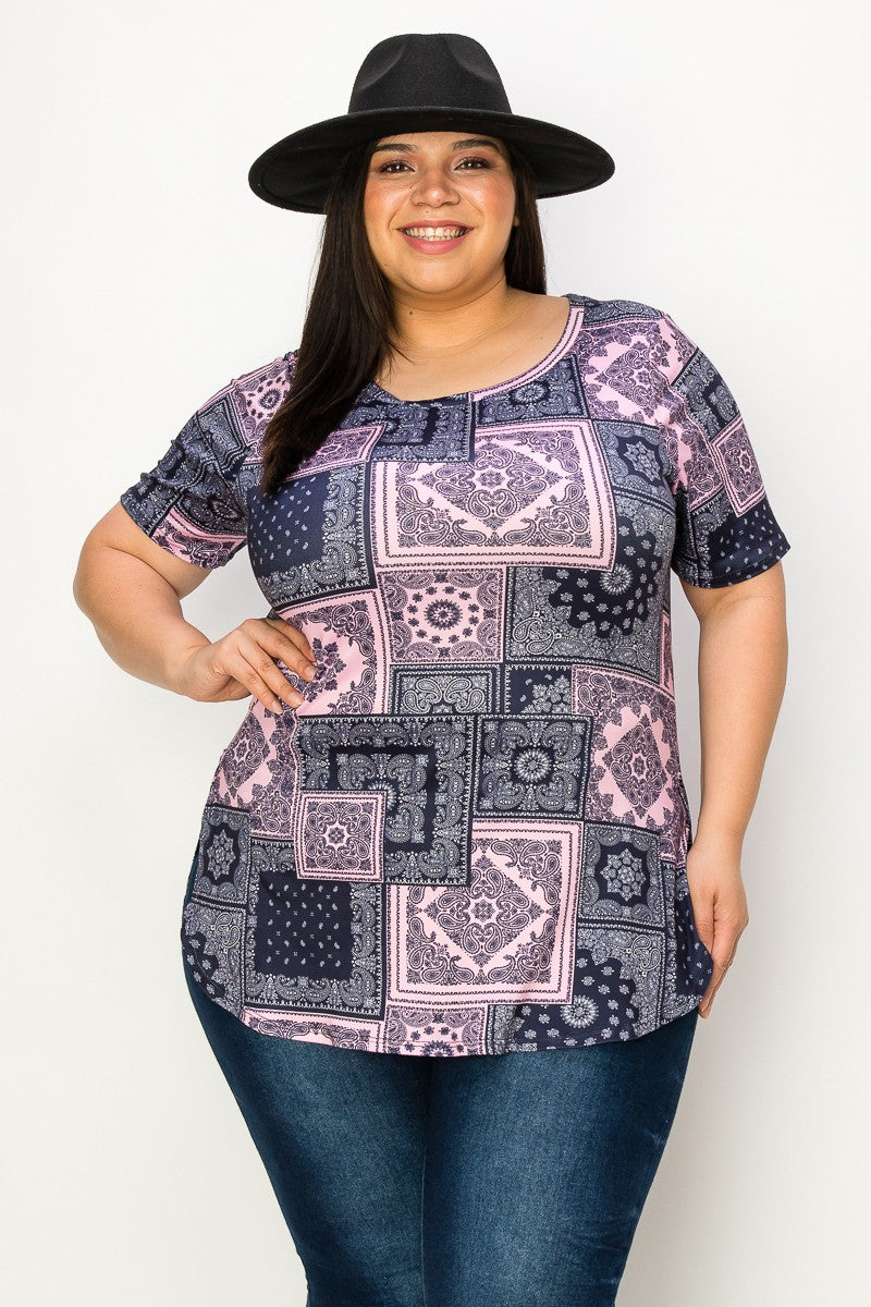 Indulge in luxury with our Plus Size Navy & Pink Patterned Top. Its short sleeves and round neck add a touch of sophistication, while the side slits provide a flattering fit for all body types. Crafted from super soft and comfortable fabric, this top is perfect for any occasion.