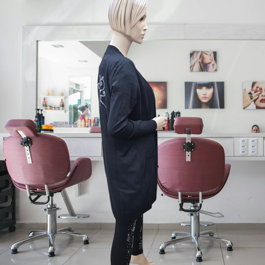 This luxurious cardigan is crafted from a soft and comfortable viscose blend, featuring a stunning rhinestone scissor design on the back, pockets, and open front. The long sleeves and rib banded tunic style add a touch of elegance and sophistication. Perfect for hair stylists who want to make a stylish statement.