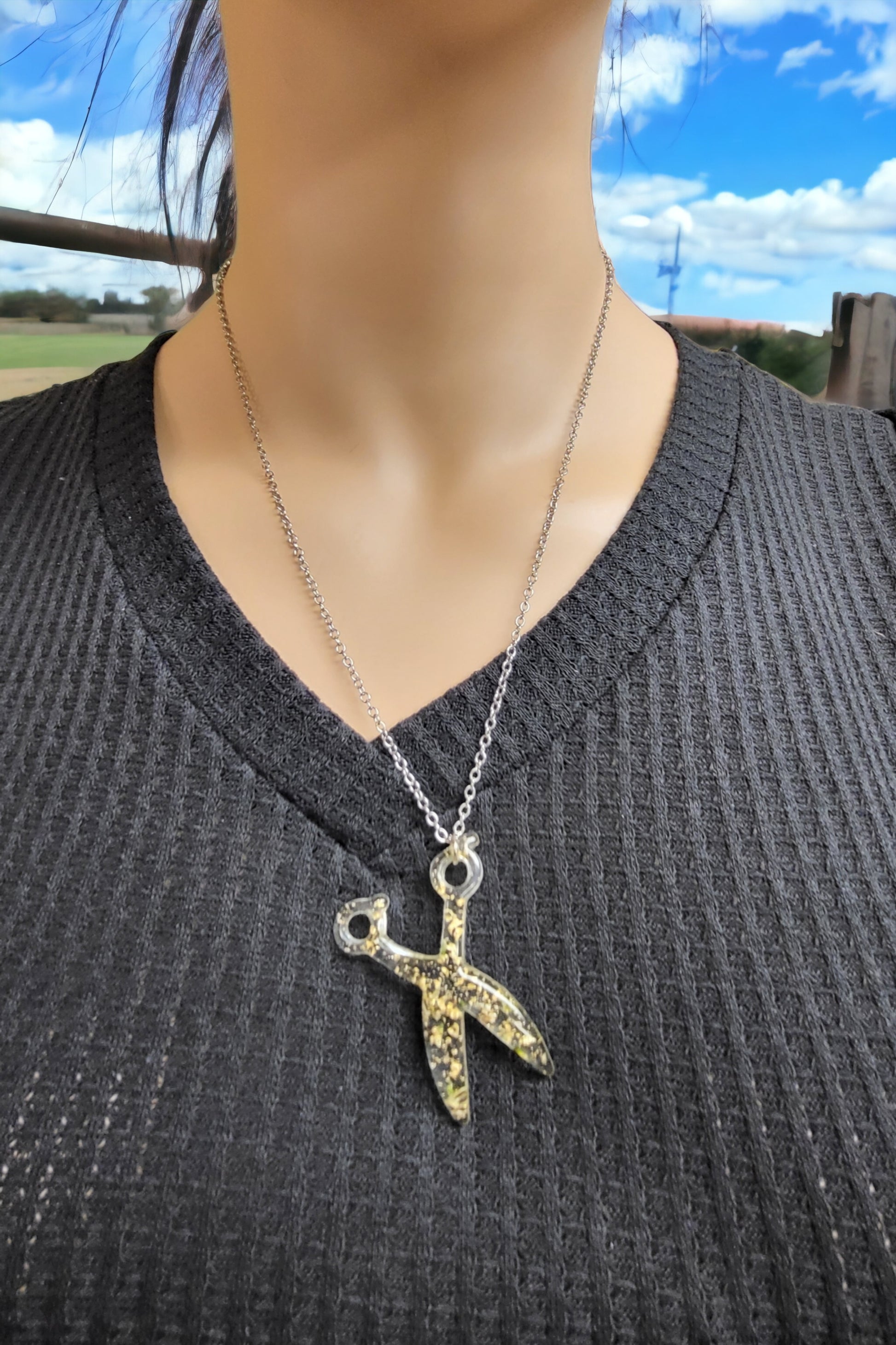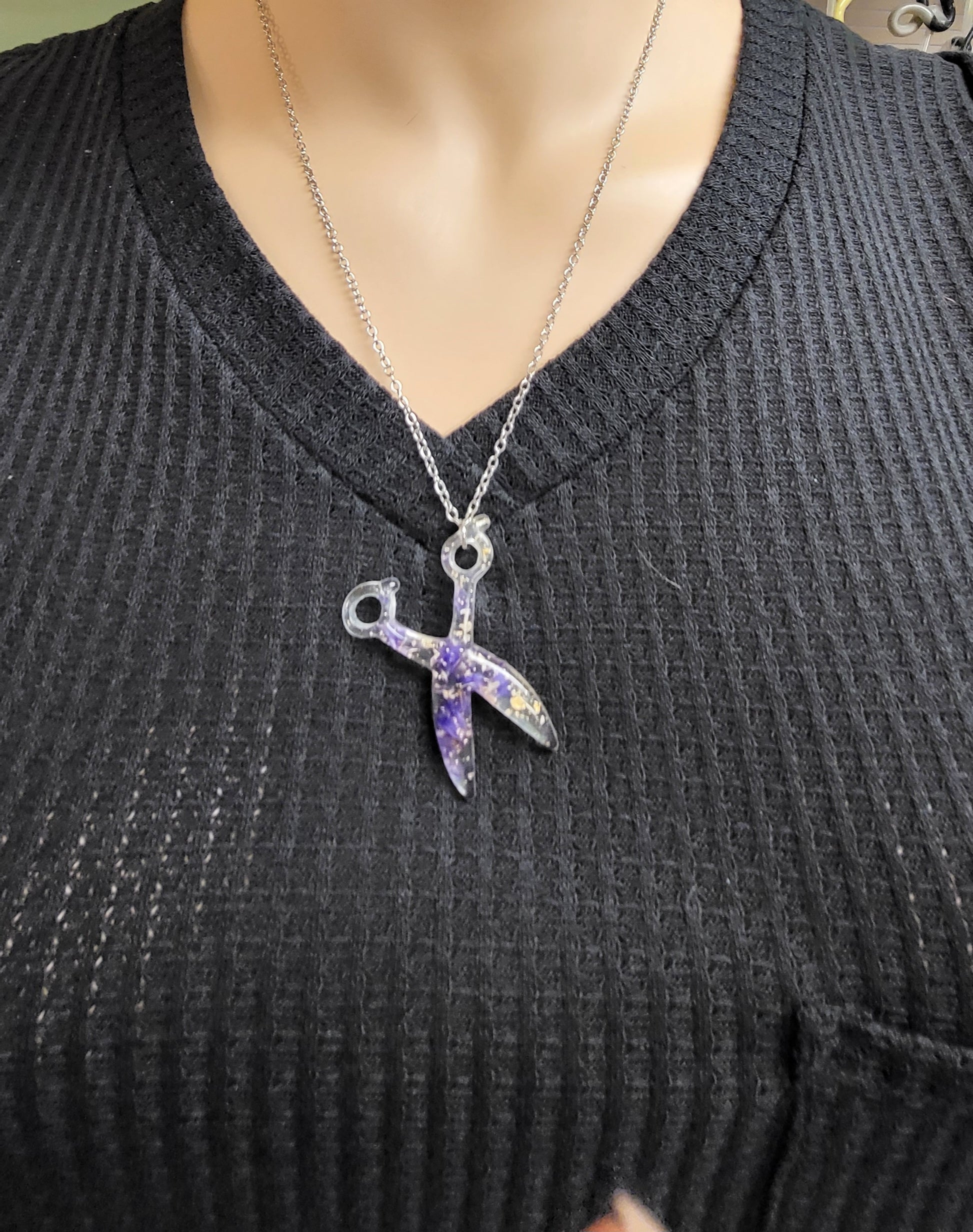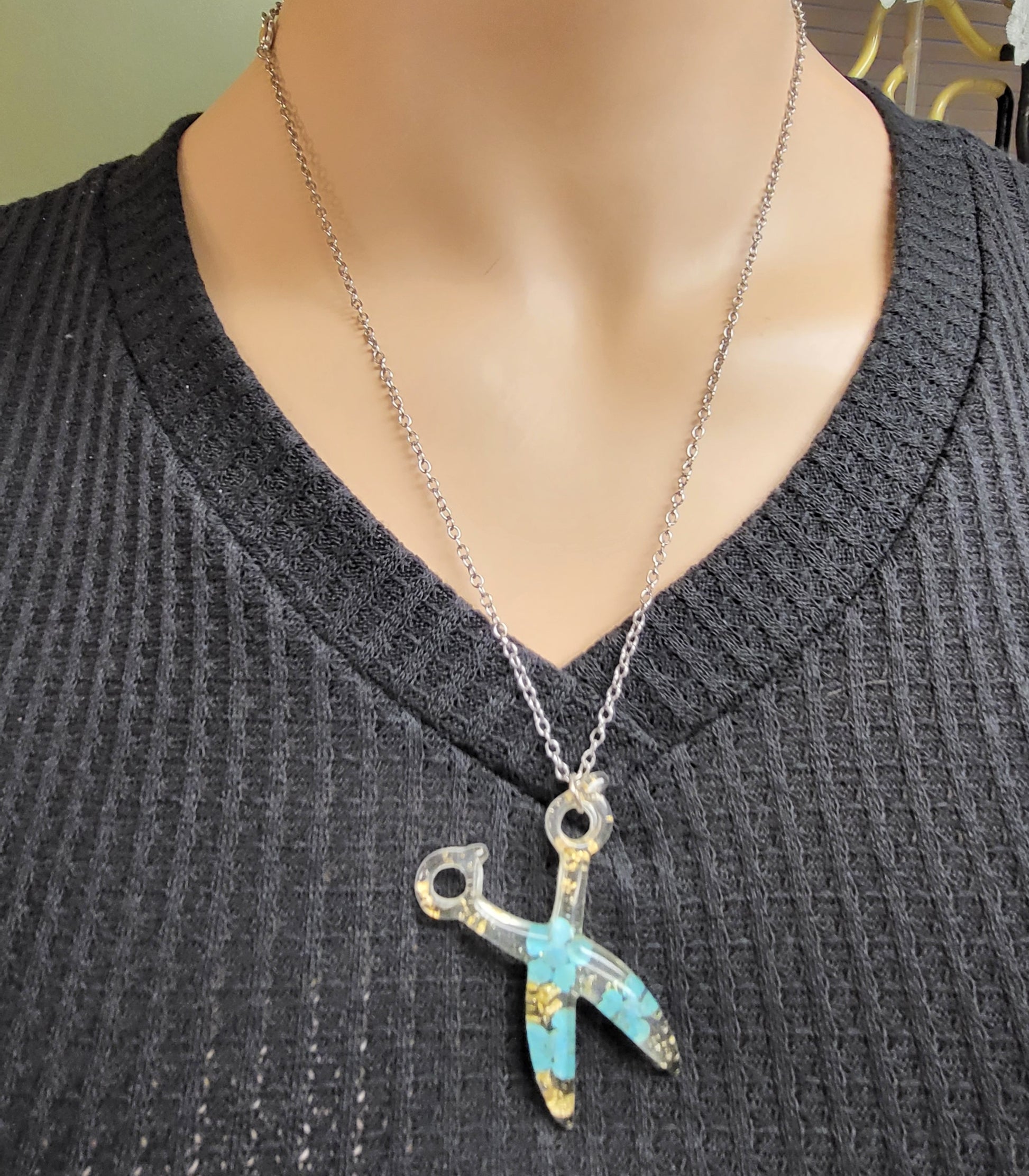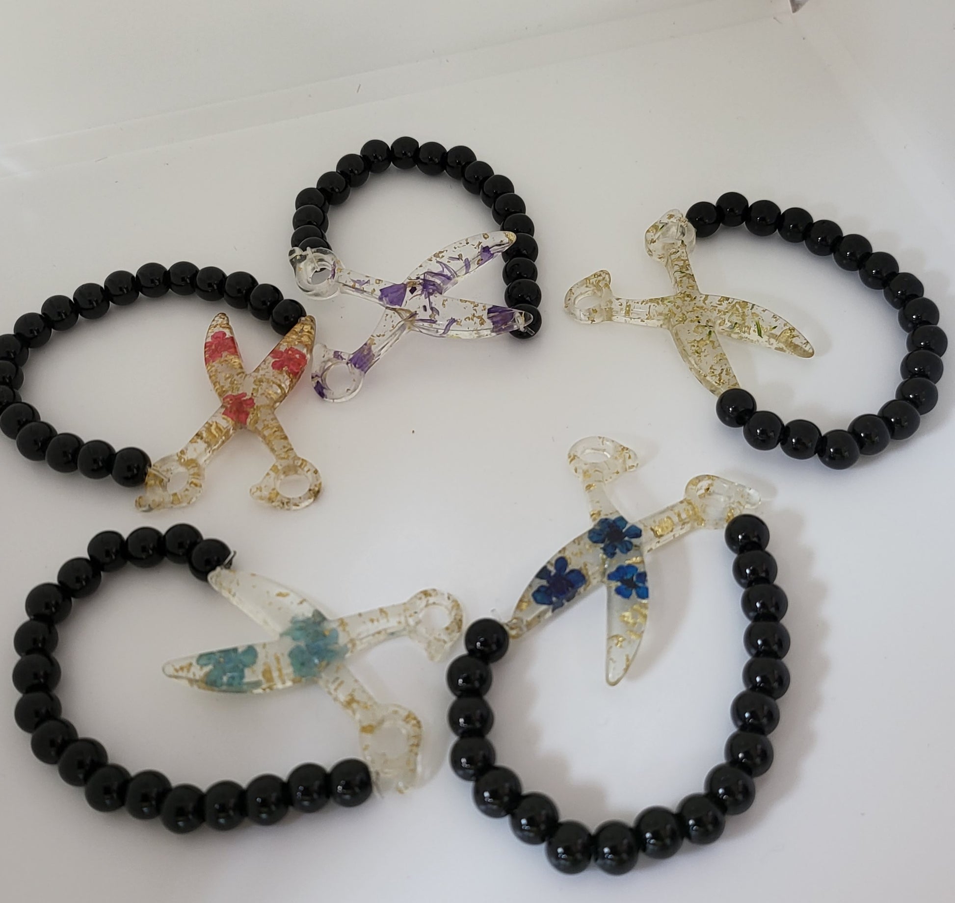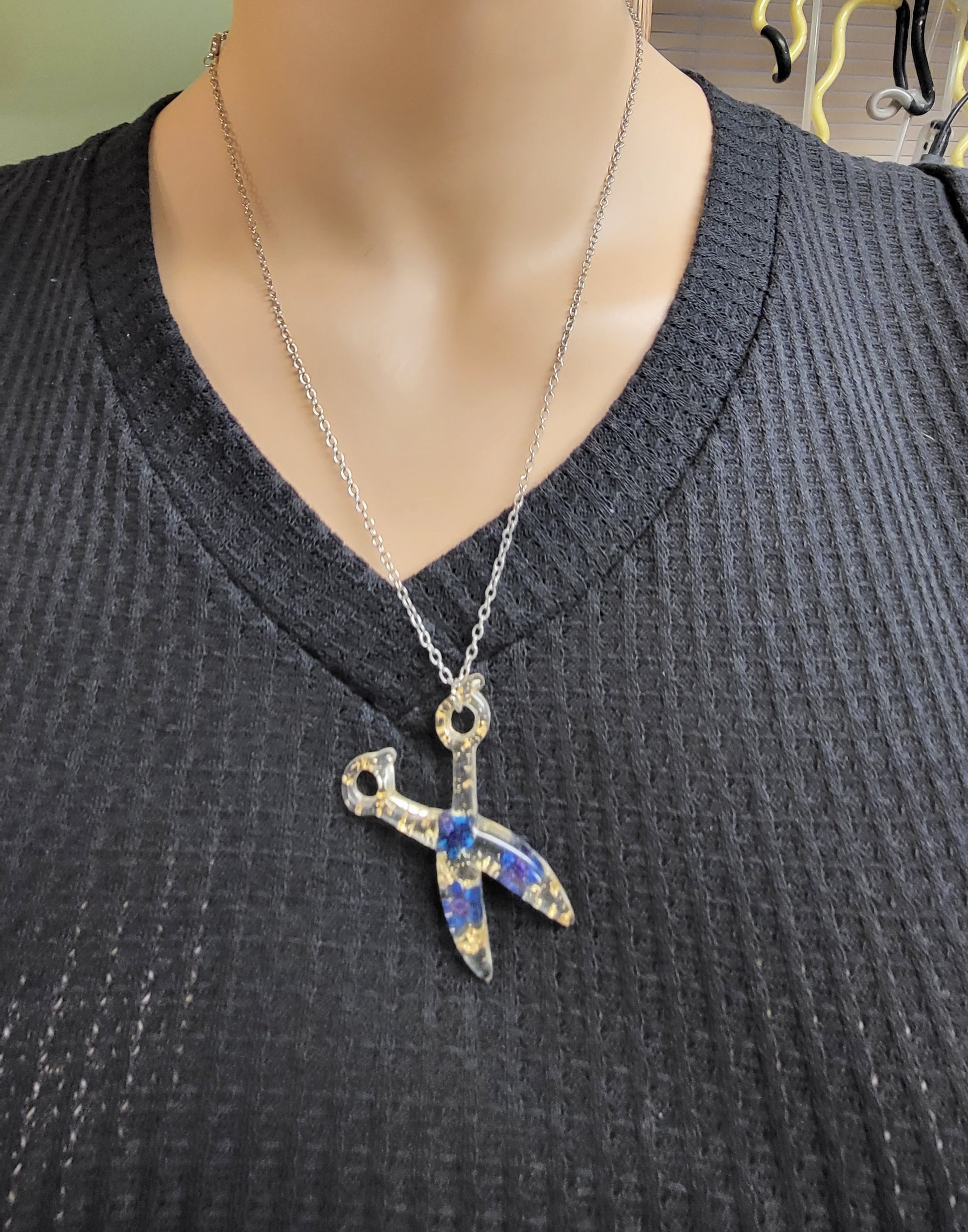 This Resin Scissor Jewelry Set is hand-made, offering a unique custom design with real flowers and flakes of foil. The set includes dangle earrings, a stretch bracelet, and a 30 inch chain necklace, with the pieces being available in 5 different colors. Sold as a set and or each piece sold separately.