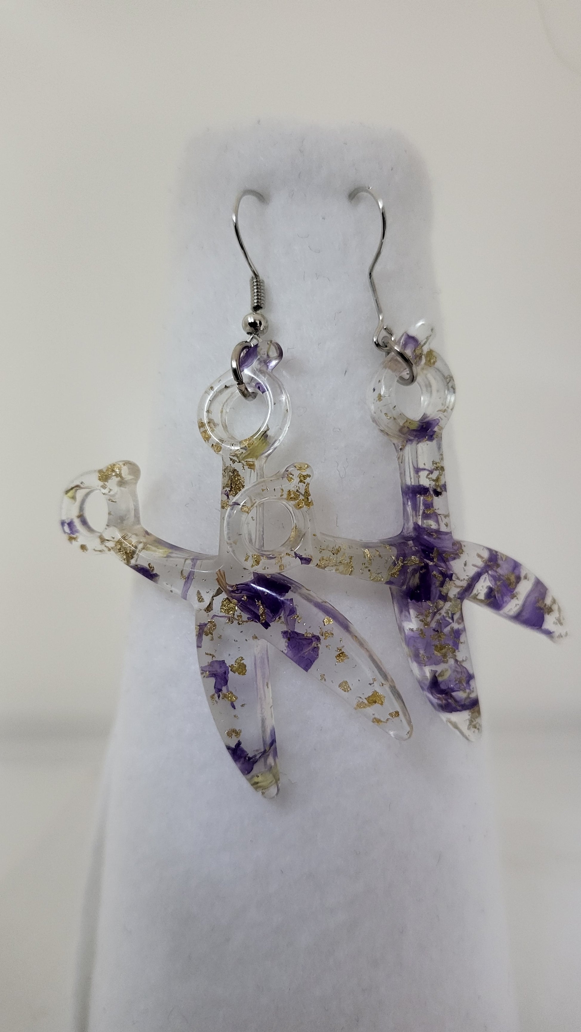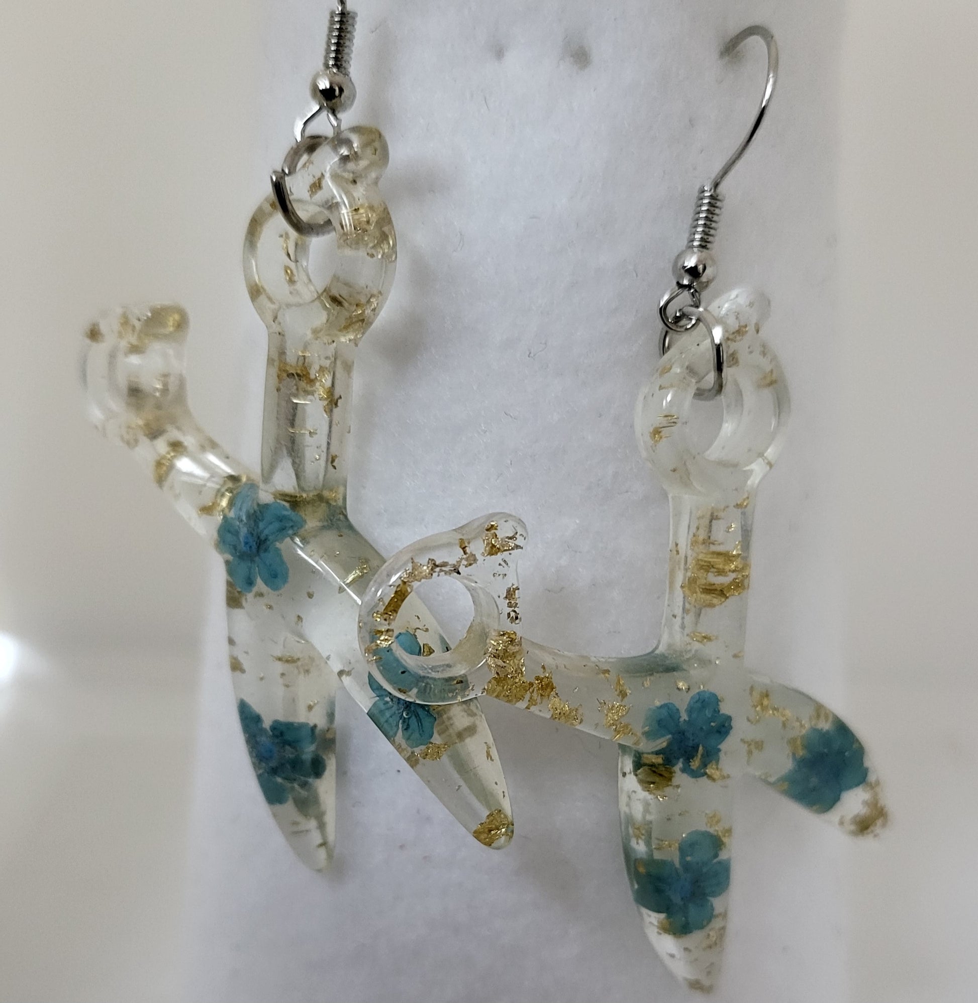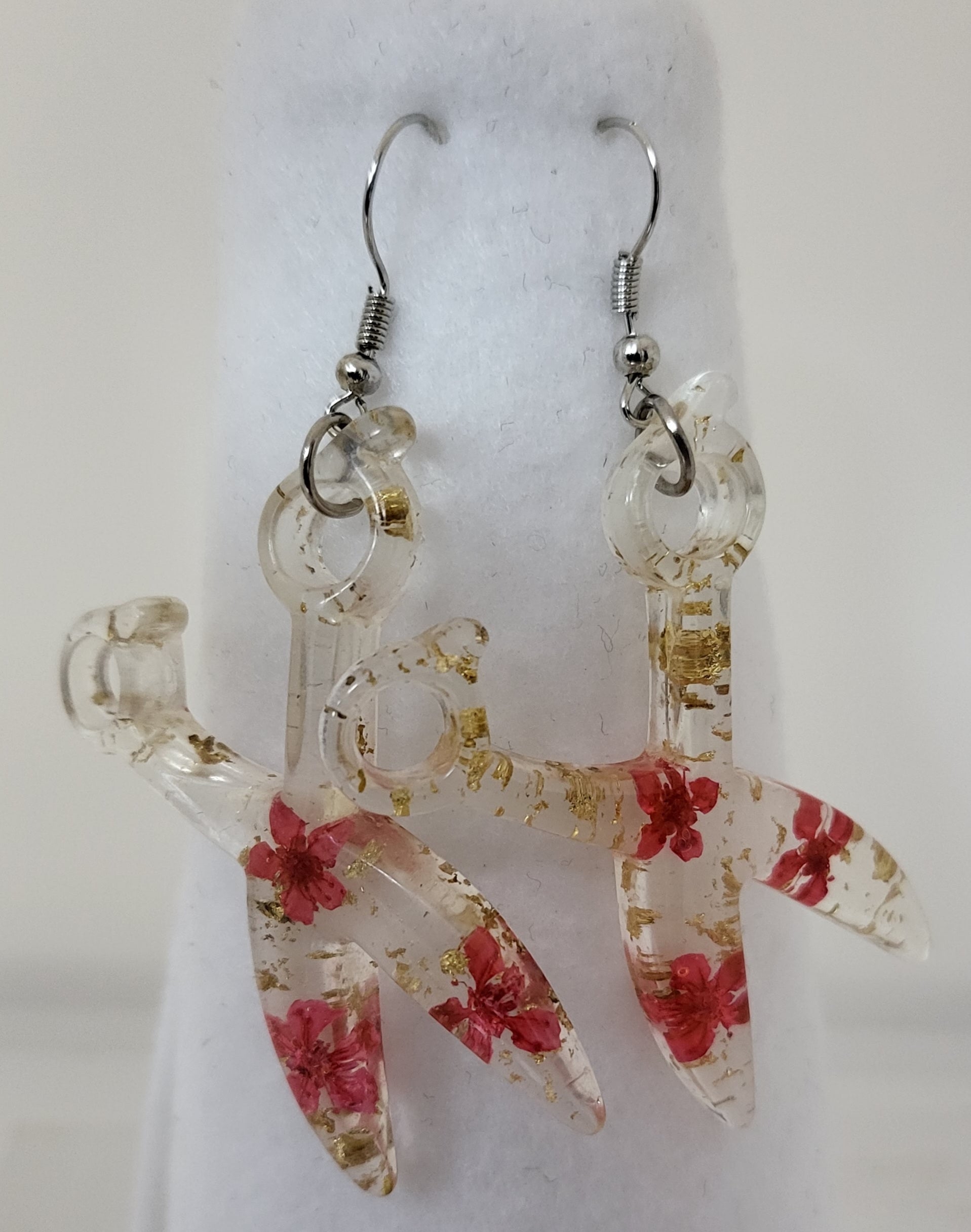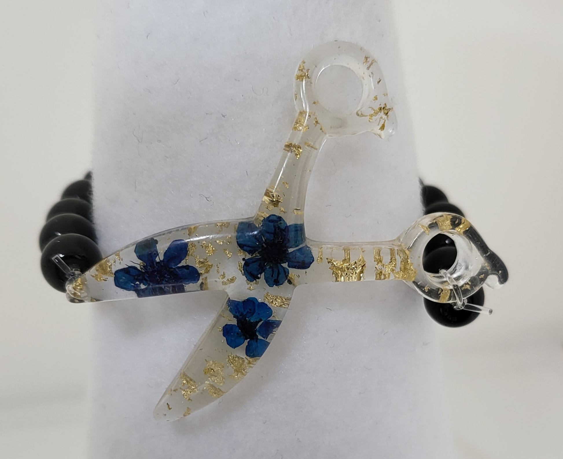 This Resin Scissor Jewelry Set is hand-made, offering a unique custom design with real flowers and flakes of foil. The set includes dangle earrings, a stretch bracelet, and a 30 inch chain necklace, with the pieces being available in 5 different colors. Sold as a set and or each piece sold separately.