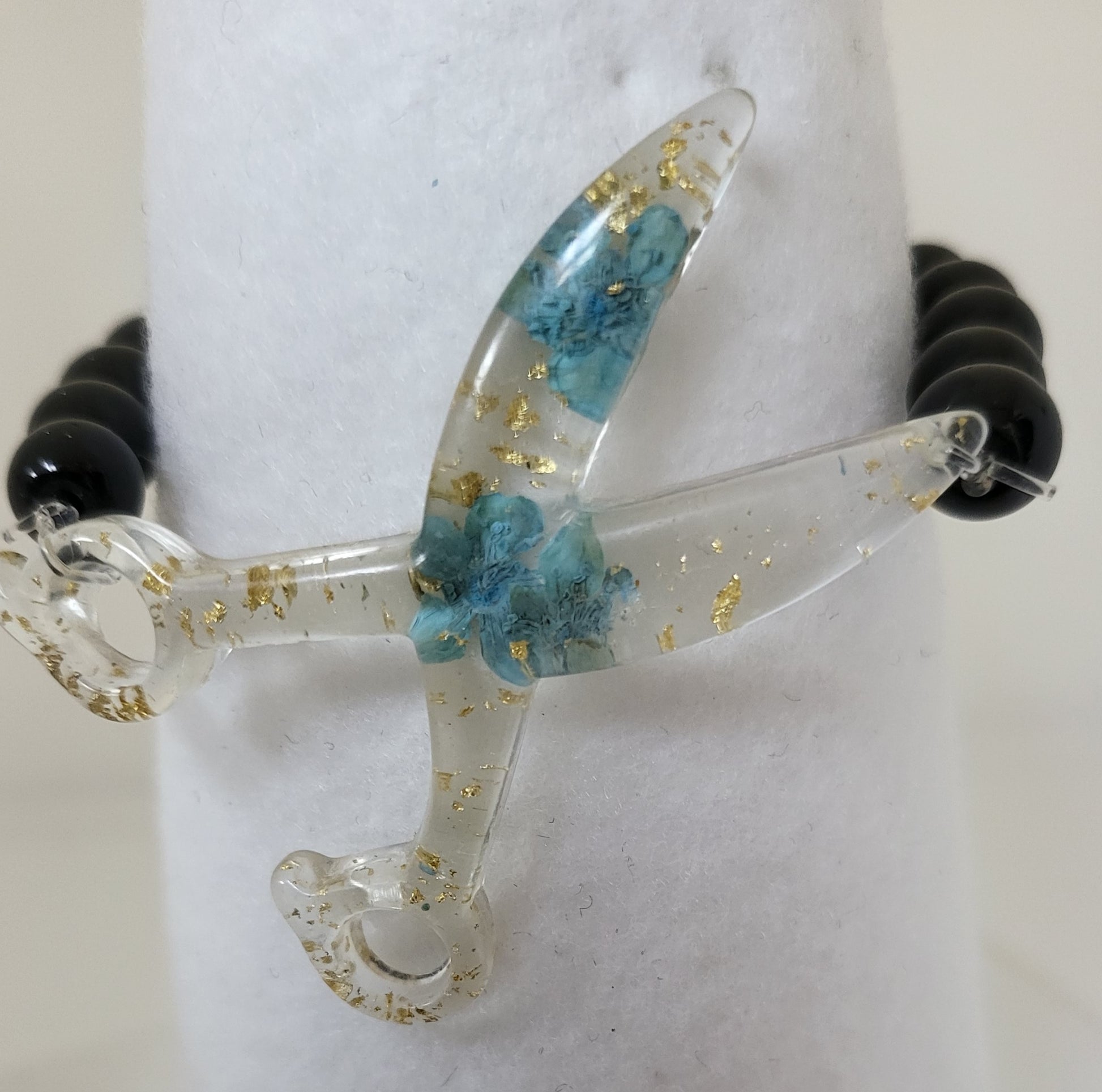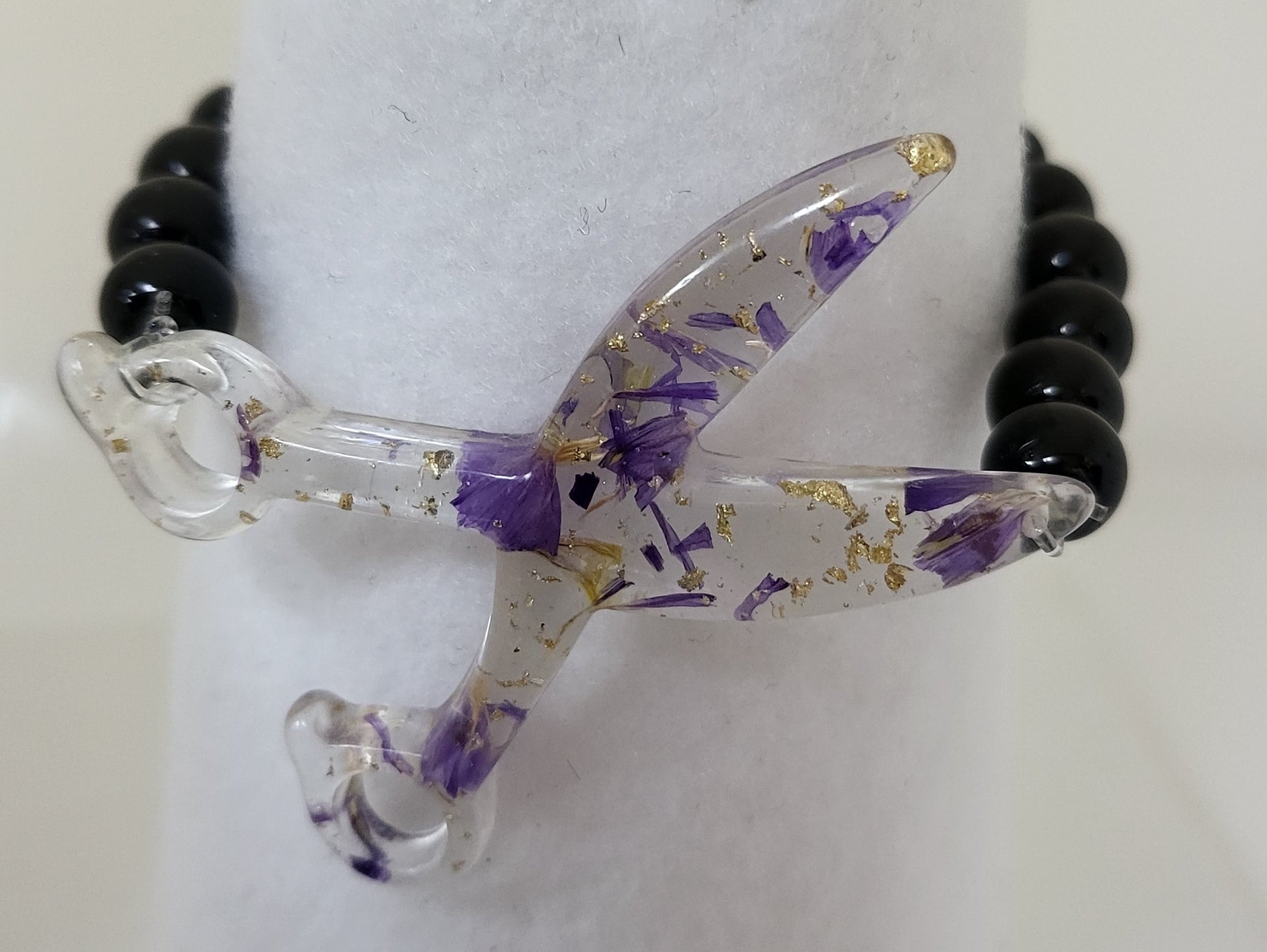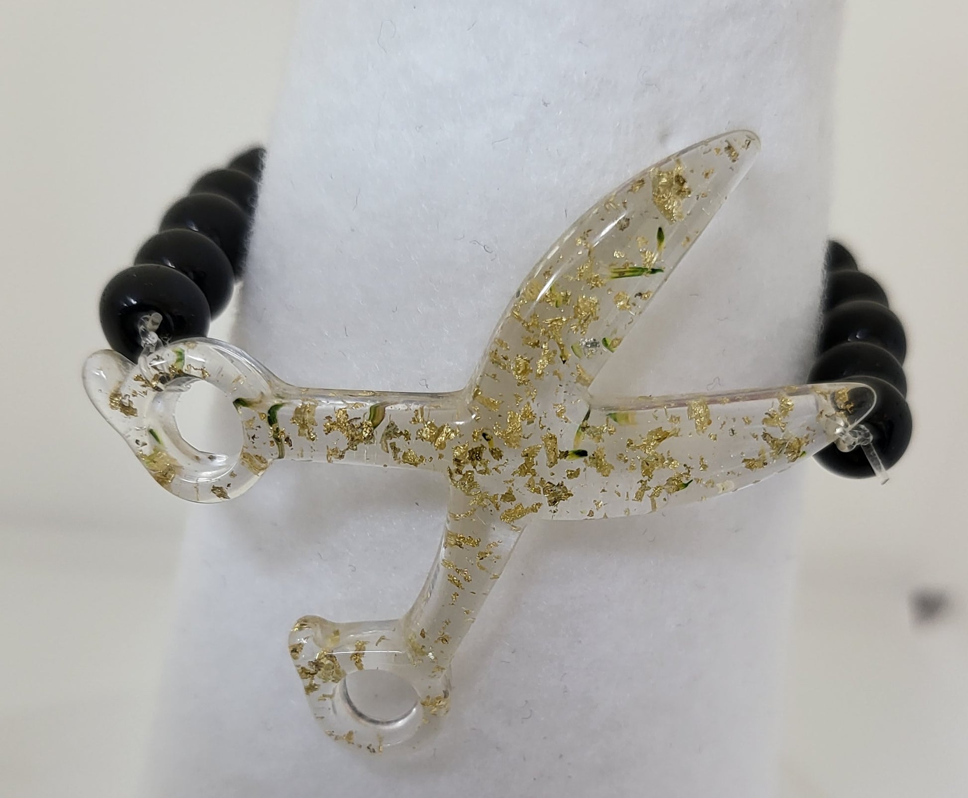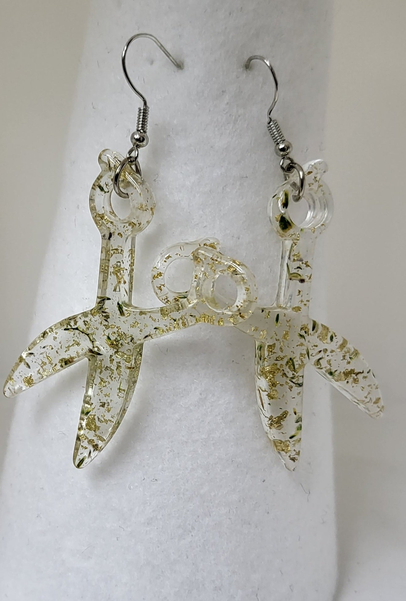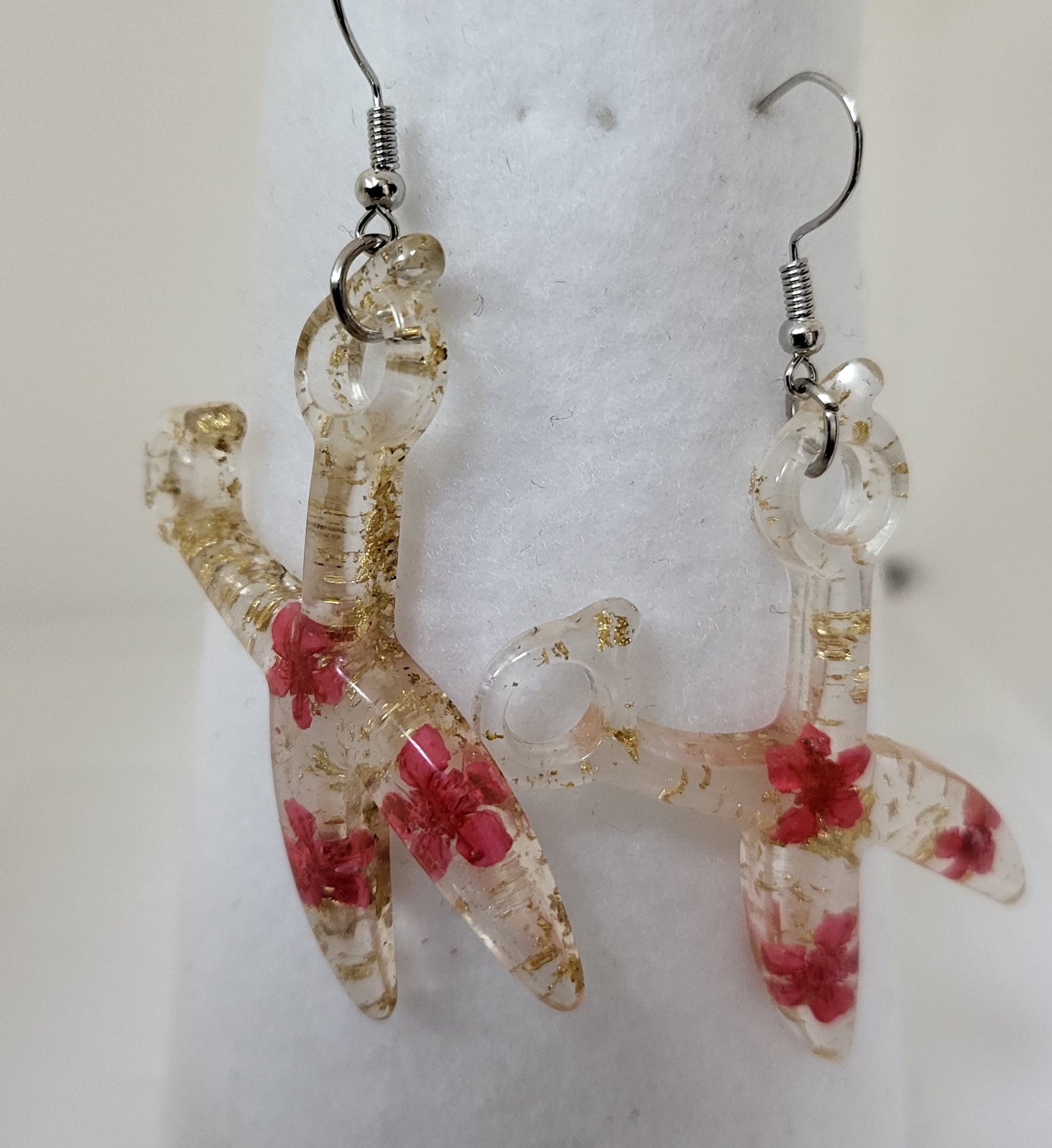 This Resin Scissor Jewelry Set is hand-made, offering a unique custom design with real flowers and flakes of foil. The set includes dangle earrings, a stretch bracelet, and a 30 inch chain necklace, with the pieces being available in 5 different colors. Sold as a set and or each piece sold separately.
