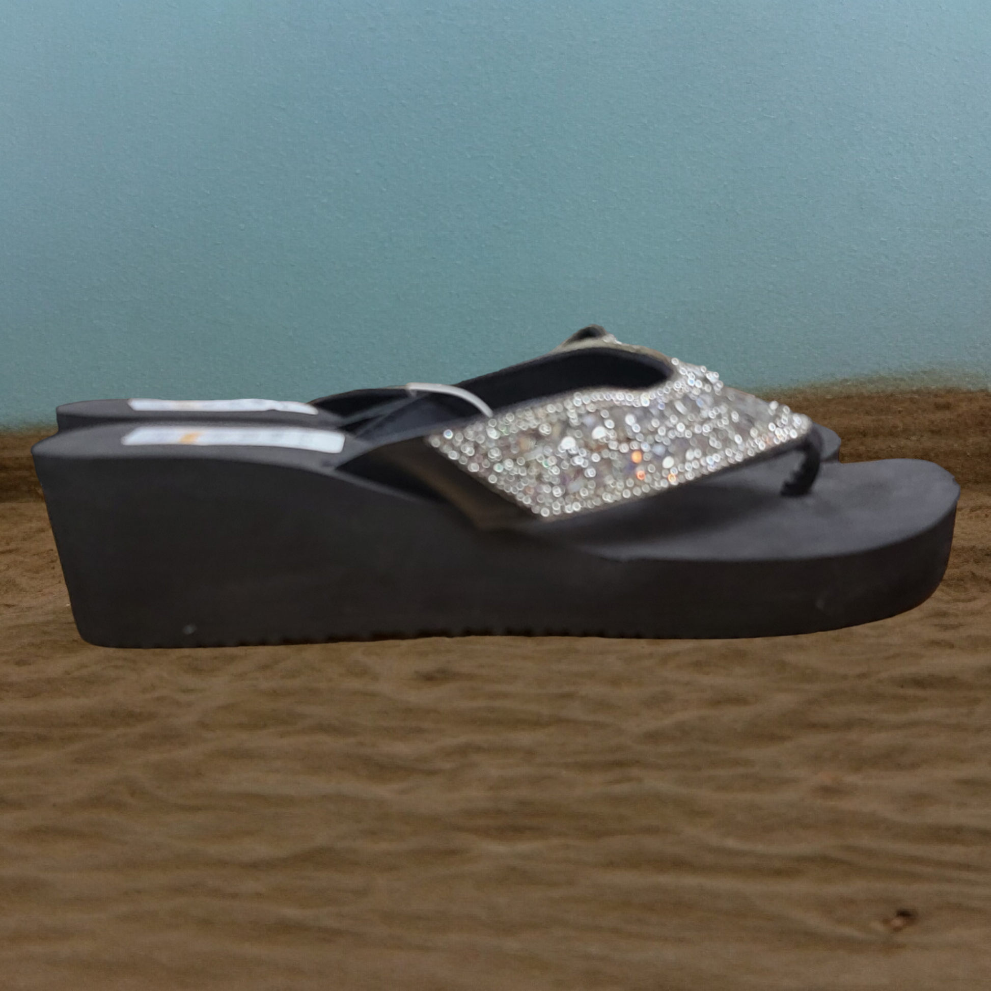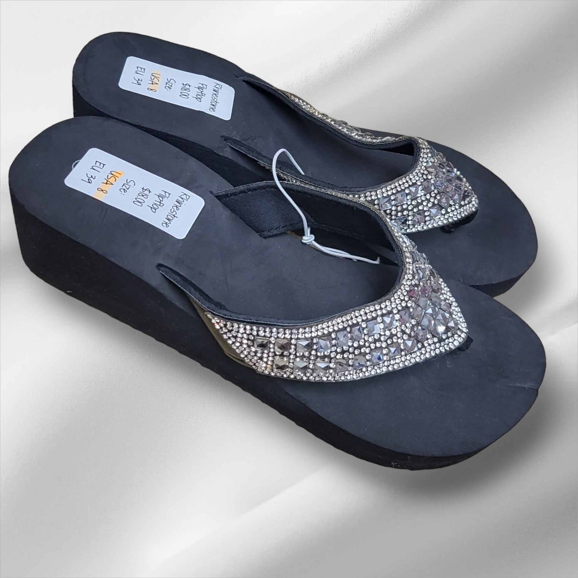 Elevate your summer style with our Rhinestone Wedge Flip Flops. These stunning sandals feature sparkling rhinestones and a fashionable wedge heel. With these flip flops, you'll be sure to make a statement while staying comfortable all day. Perfect for any occasion, from the beach to a night out.