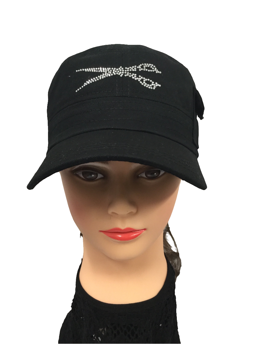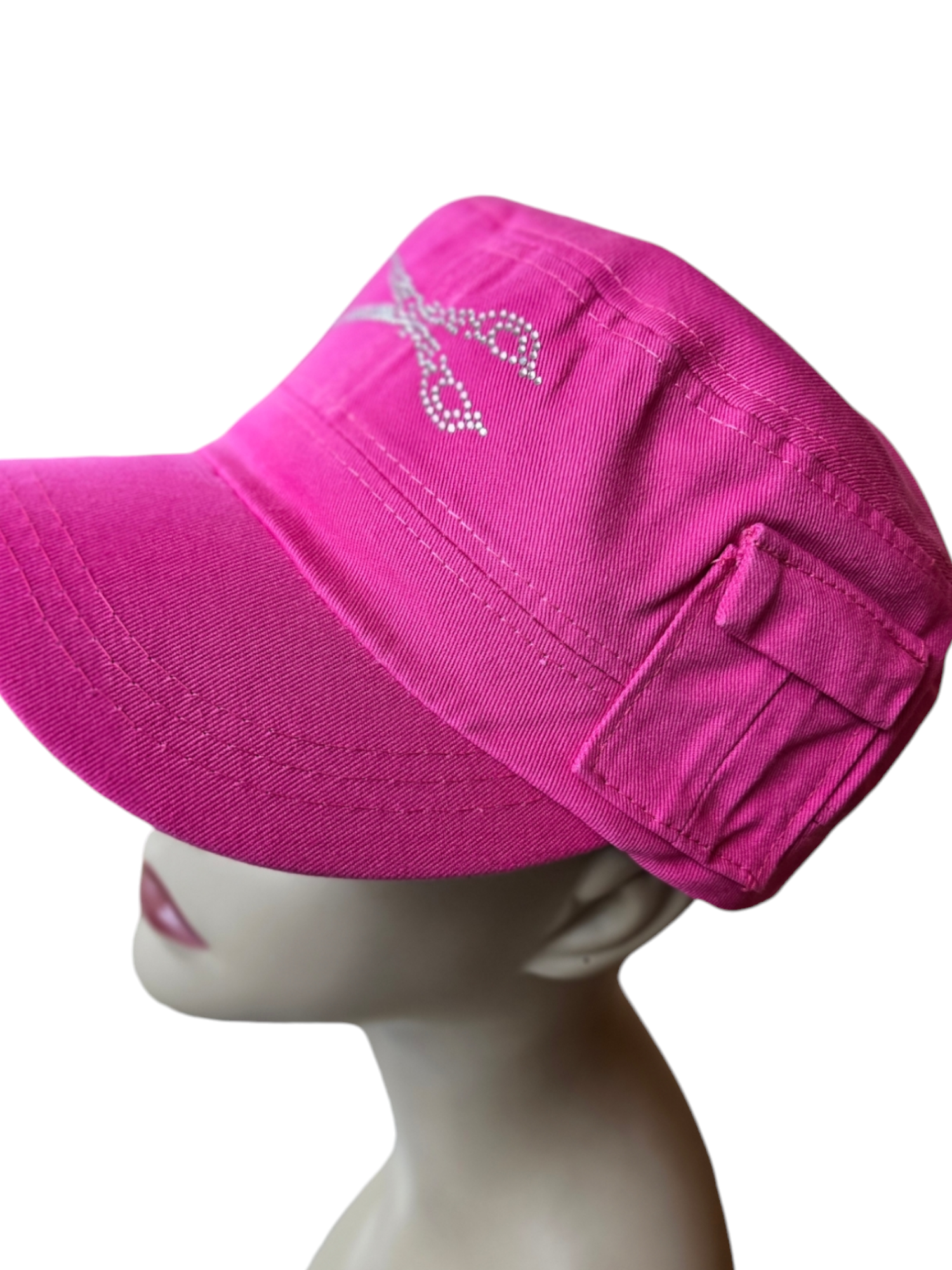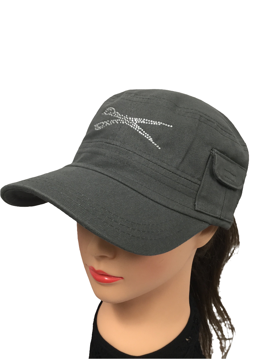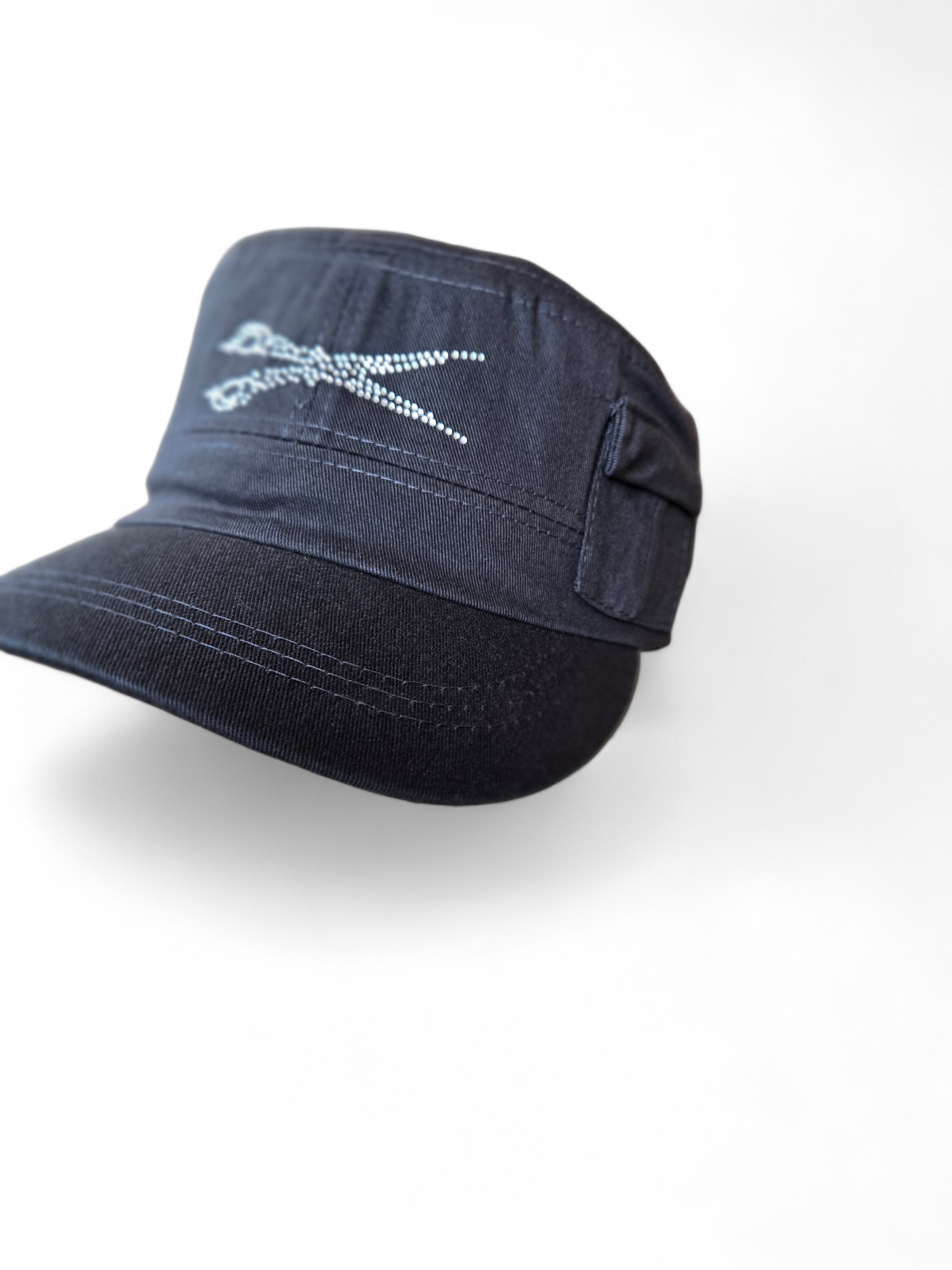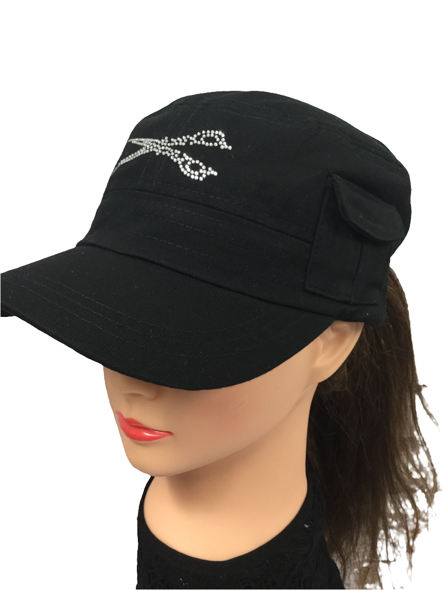 Indulge in the luxurious elegance of our signature rhinestone-adorned military style hat, complete with a tiny side pocket for a subtle touch of charm. The adjustable Velcro back adds a convenient and stylish element to this must-have accessory.