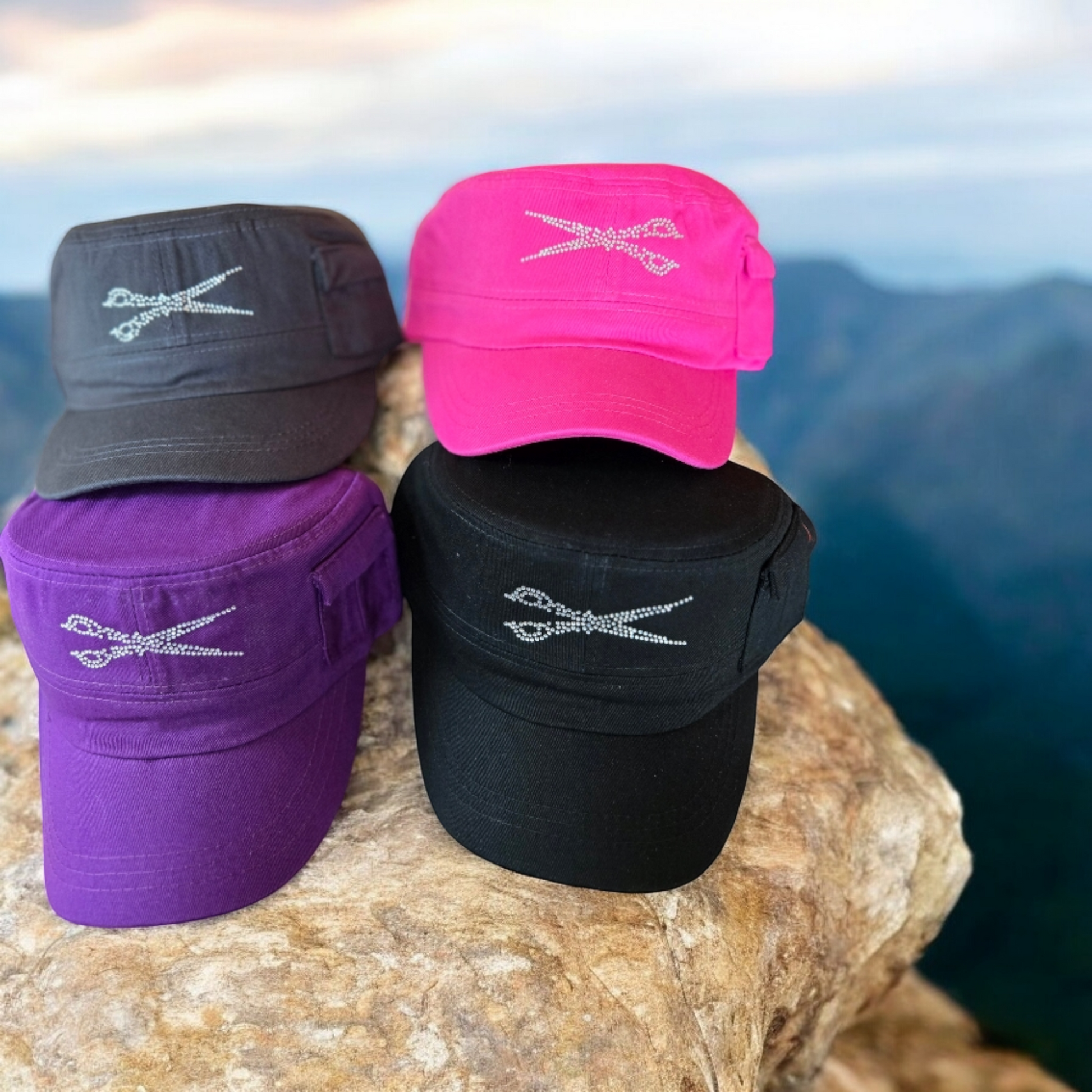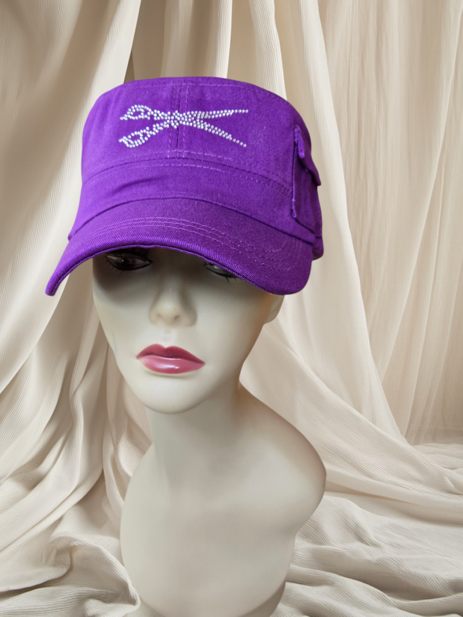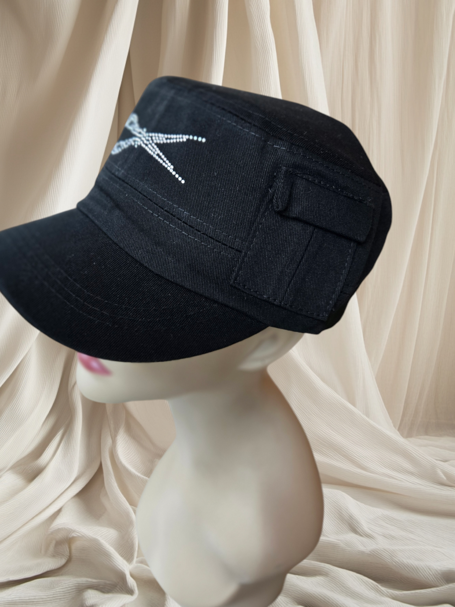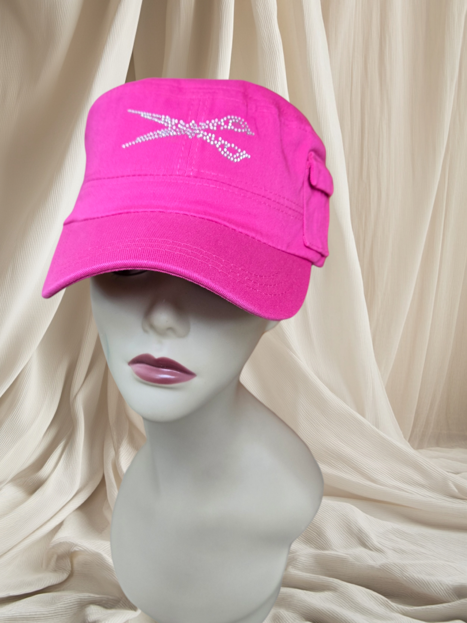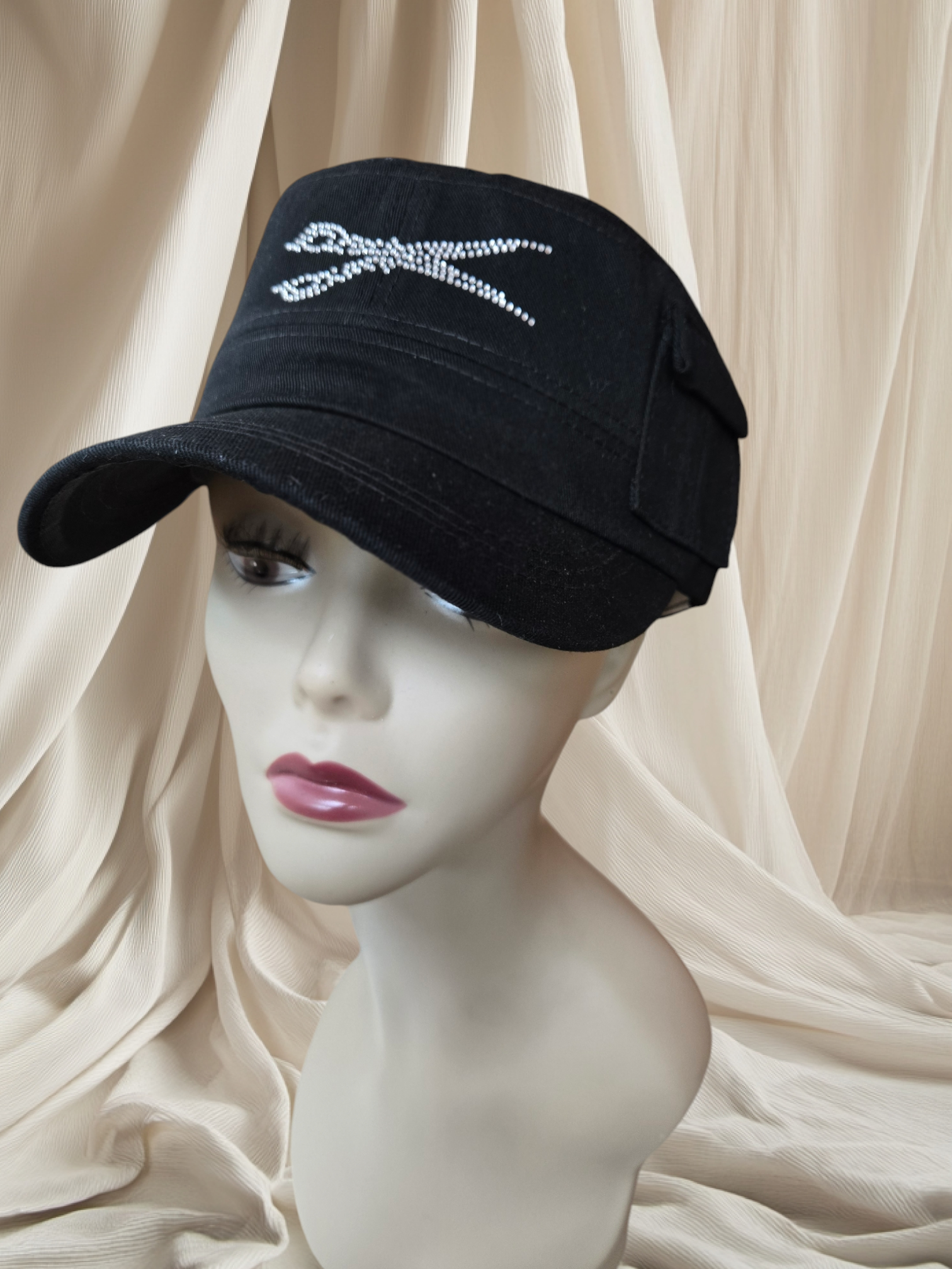 Indulge in the luxurious elegance of our signature rhinestone-adorned military style hat, complete with a tiny side pocket for a subtle touch of charm. The adjustable Velcro back adds a convenient and stylish element to this must-have accessory.