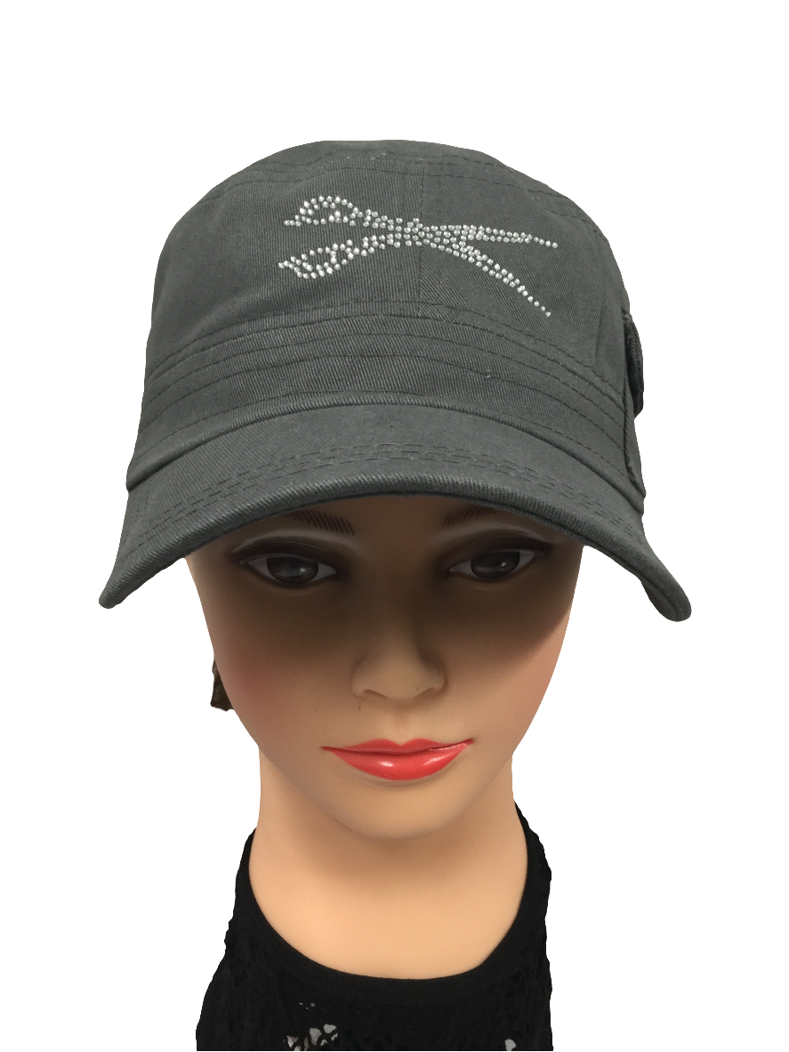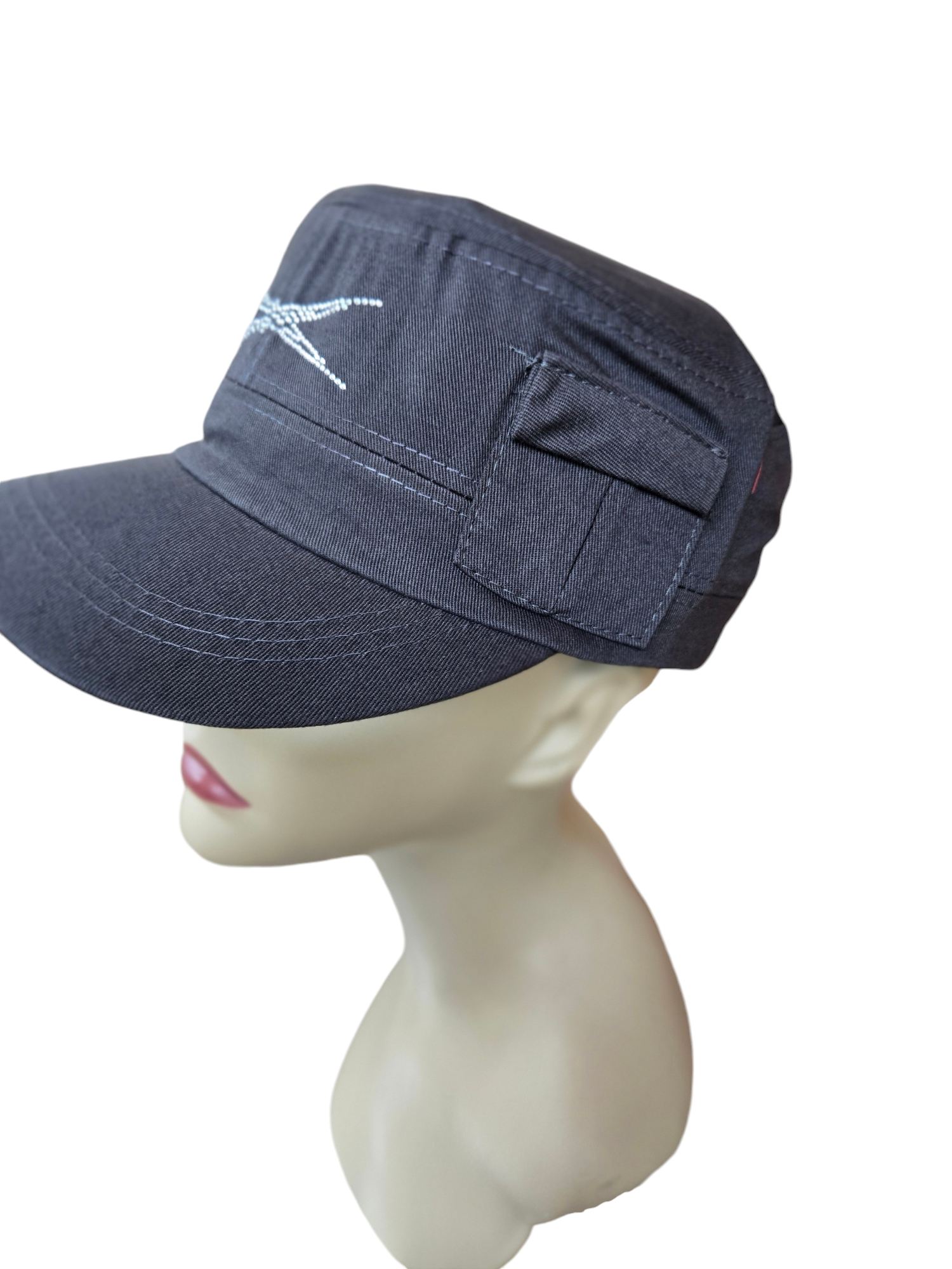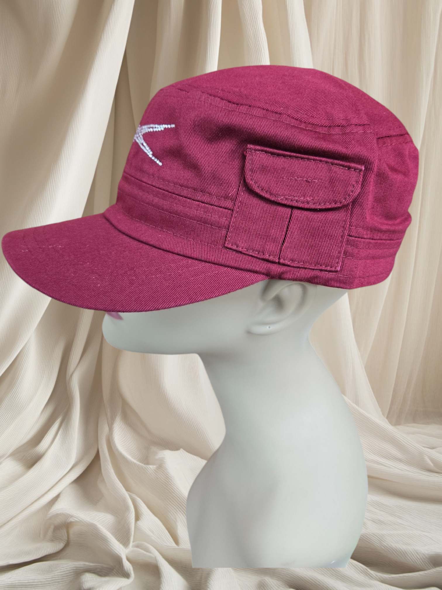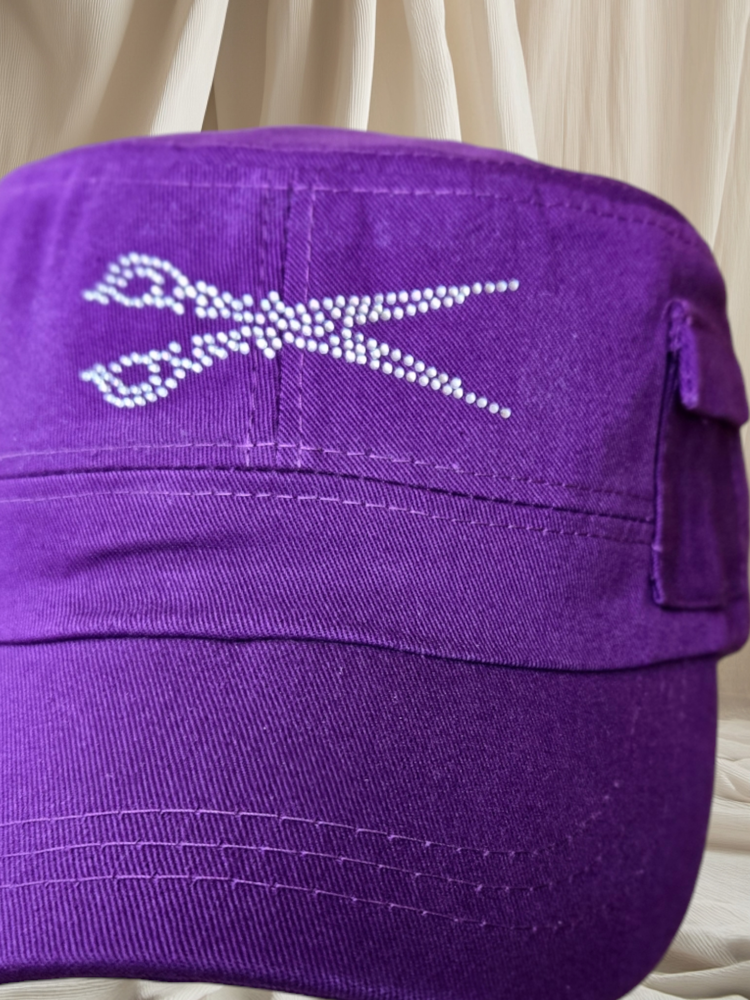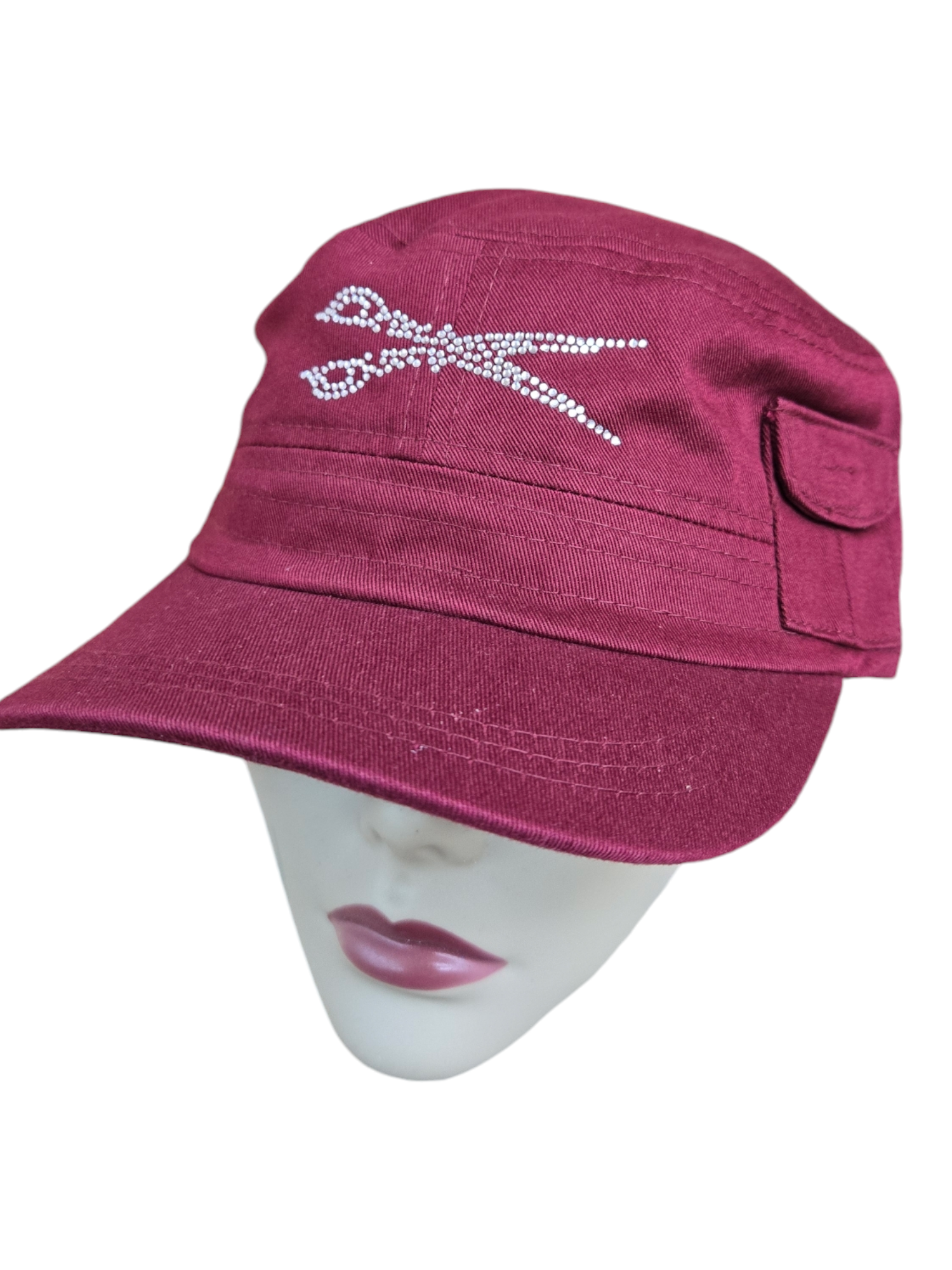 Indulge in the luxurious elegance of our signature rhinestone-adorned military style hat, complete with a tiny side pocket for a subtle touch of charm. The adjustable Velcro back adds a convenient and stylish element to this must-have accessory.