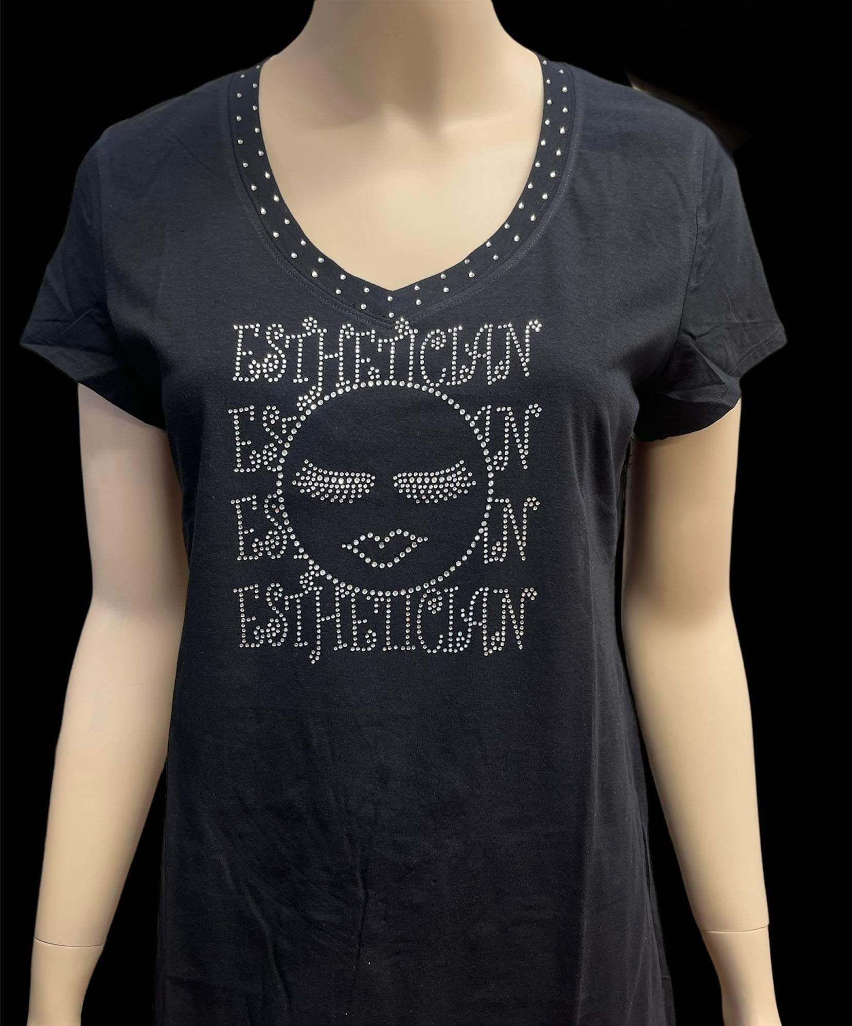 Solid black short sleeve fitted shirt with rhinestone embellished neck line and custom rhinestone smile artwork.