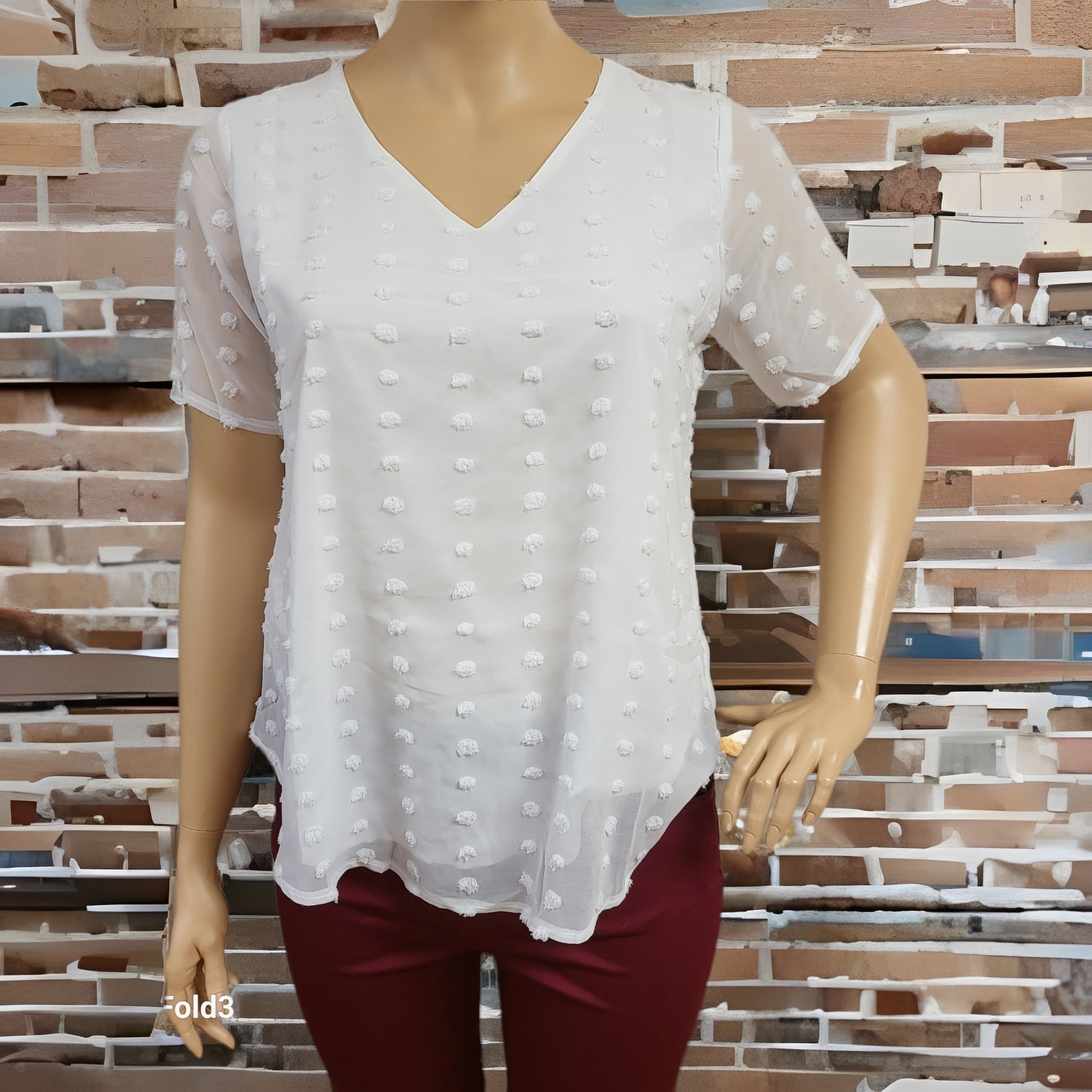 SWISS DOT SHORT SLEEVE V-NECK ROUND HEM TOP - LINED TOTAL BODY LENGTH: 27.5", BUST: 40" approx. - MEASURED FROM SMALL ** COLOR MAY VARY SLIGHTLY DUE TO MONITOR RESOLUTION