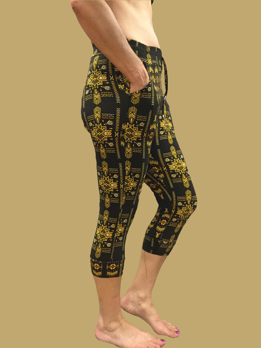 Introducing the Golden Chocolate Capri with Pockets. Designed with a striking brown and gold print, this capri features a 2-inch waist band and a fake tie for added style. The cuffed hem leg and calf length provide a versatile look, while the super soft legging material ensures comfort. Perfect for both casual and dressy occasions, these capris also come equipped with pockets for added functionality. Elevate your wardrobe with these comfortable and fashionable capris.