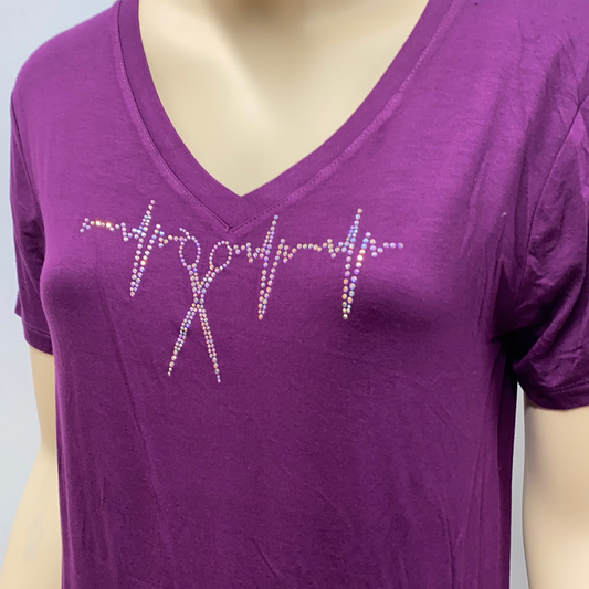 Magenta V-Neck with Iridescent Heartbeat and Scissor Rhinestones