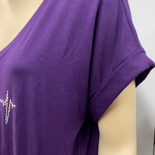 Plum V-neck Tee with Rolled Sleeves with Iridescent Scissor Heartbeat rhinestones