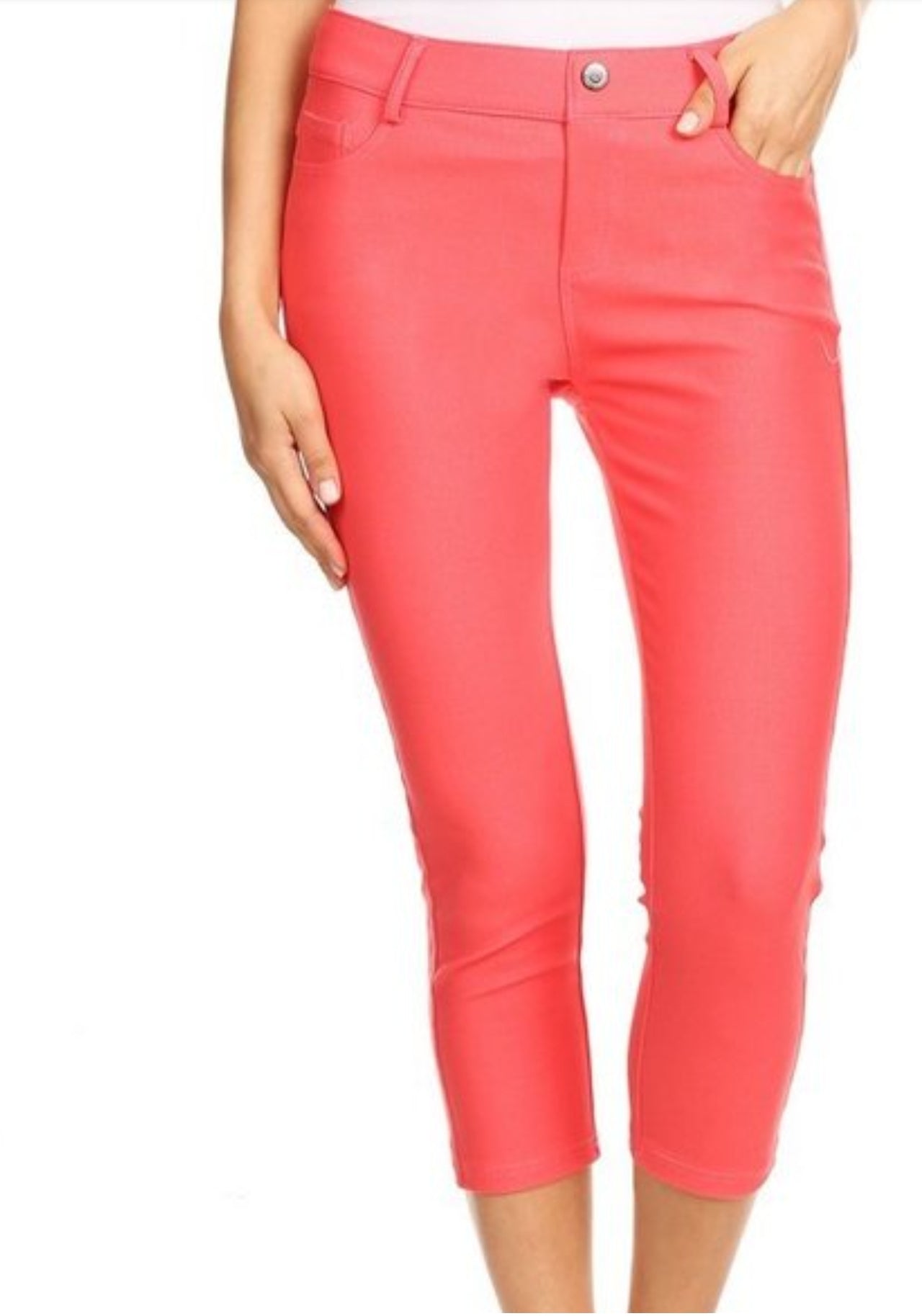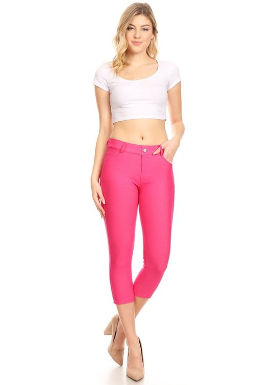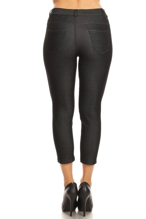 These capri jeggings are styled to resemble a pair of jeans. Get both comfort and style! Full length jeggings featuring a light sheen and jean-style construction Lightweight, breathable cotton-blend material for all day comfort Belt loops with 5 functional pockets Super Stretchy Pull up Style