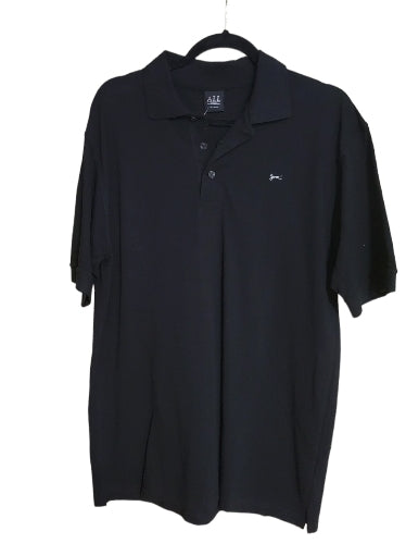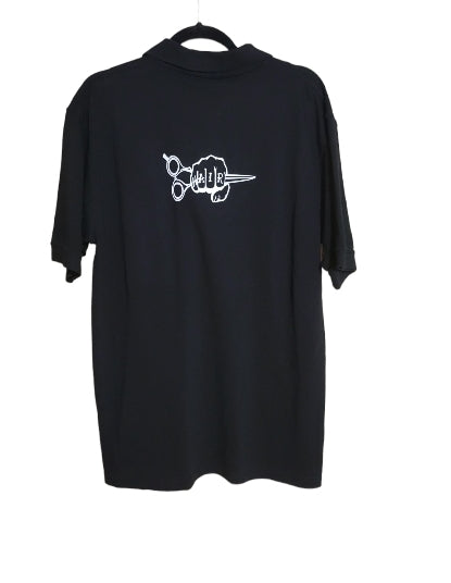 This is a polo style shirt with a small embroidery scissor on the front and vinyl  artwork on the back.