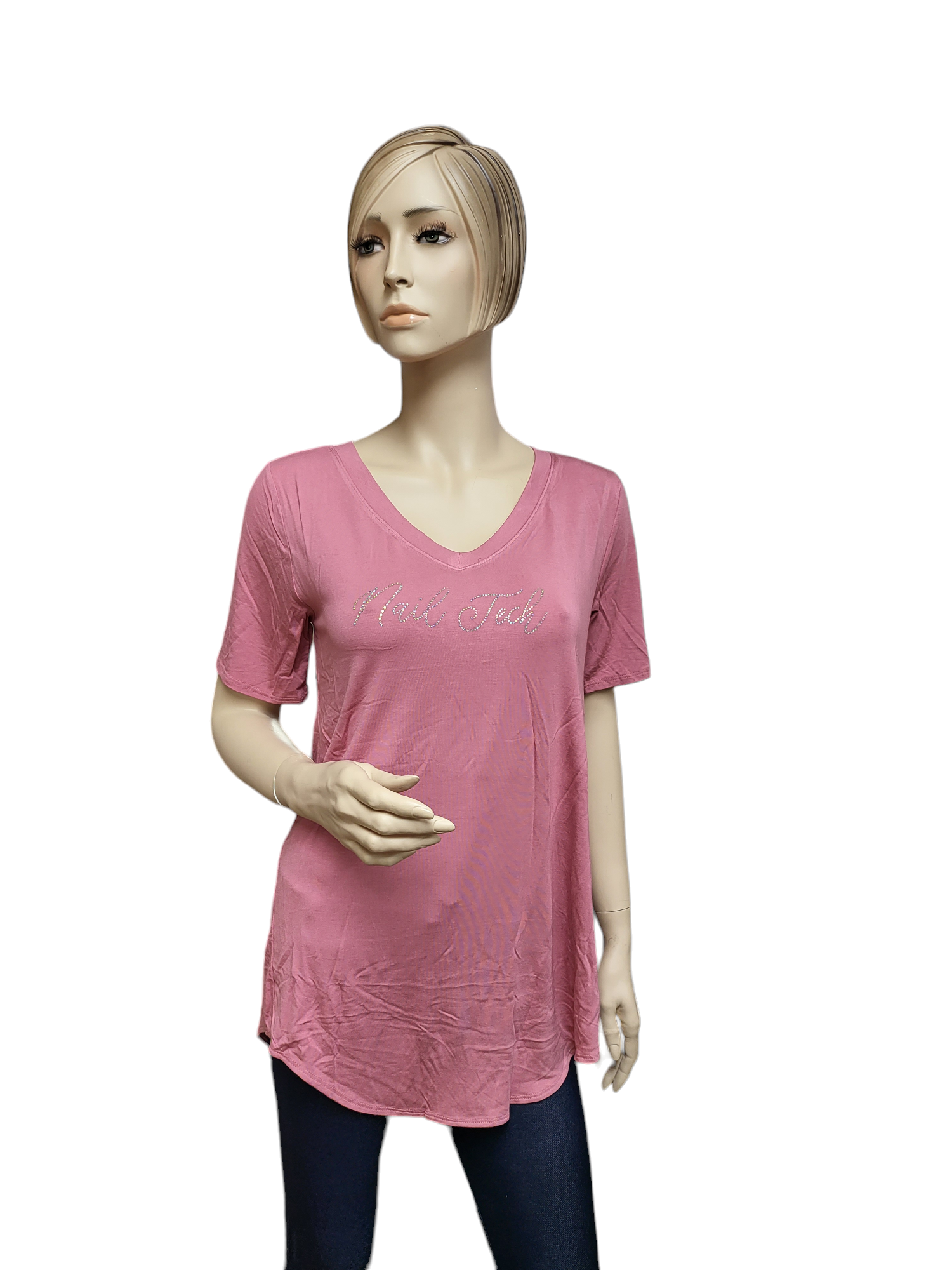 The Nail Tech Dusty Pink Tunic is made from rayon fabric for a comfortable experience. It features a v neck, short sleeves, and round bottom to flatter your figure. Perfect for dressing up with jeans or our custom print v-shaped leggings.