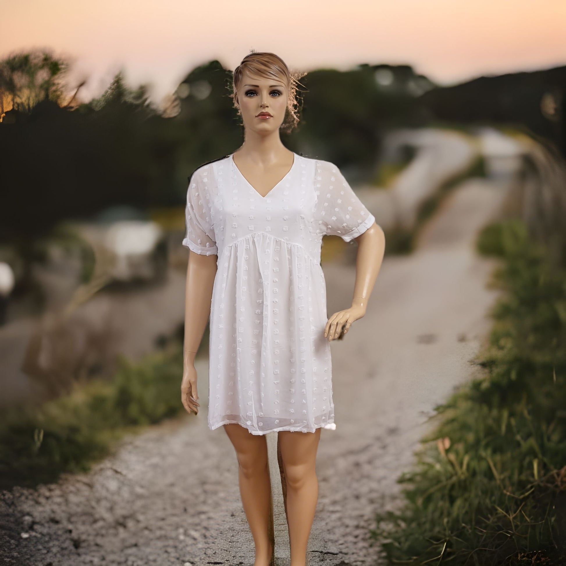 SWISS DOT BABYDOLL V-NECK DRESS - LINED TOTAL BODY LENGTH: 35.5", BUST: 40" approx. - MEASURED FROM SMALL