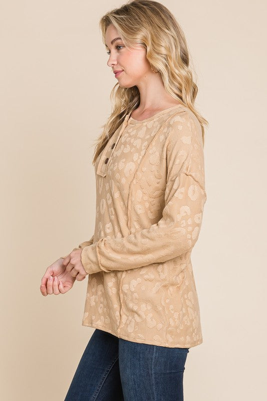 Here’s a playful description for your Textured Top with Button Neckline: This soft knit top brings comfy chic to your wardrobe with its button-front charm and easy drop shoulder fit. The subtle top stitch adds a touch of texture, while long sleeves keep you cozy all day (or night). Made with a stretchy blend of polyester and spandex, it moves with you—and the relaxed fit means no fuss, just fun! Perfect for dressing up or down, proudly made in the USA and ready to become your new go-to piece.