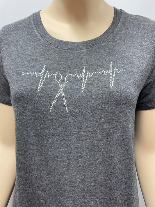 Short Sleeve Gray Classic Tee with Heartbeat Scissor Rhinestone