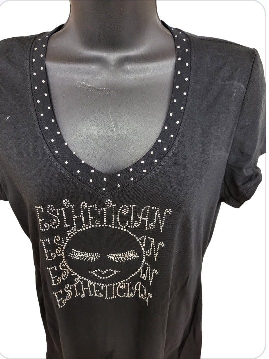 Plus size top with custom Esthetician Rhinestone Design.
